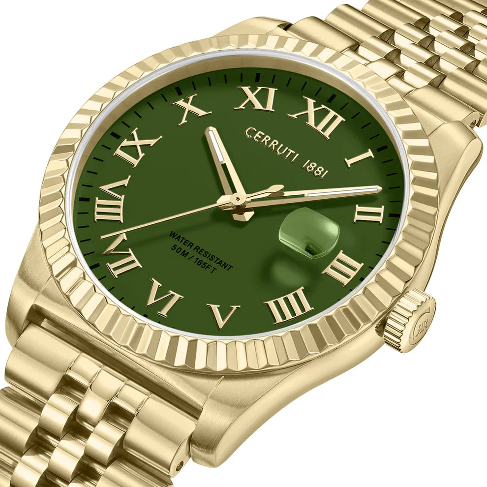 This Cerruti 1881 Baccio watch is a stylish and functional timepiece for the modern man. The watch features a green dial with a gold-tone stainless steel case and bracelet. The dial is adorned with Roman numerals and a date window, adding a classic and sophisticated look.