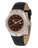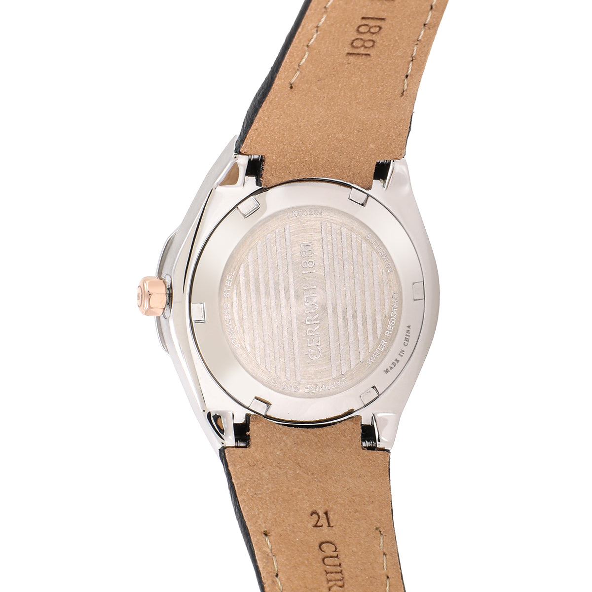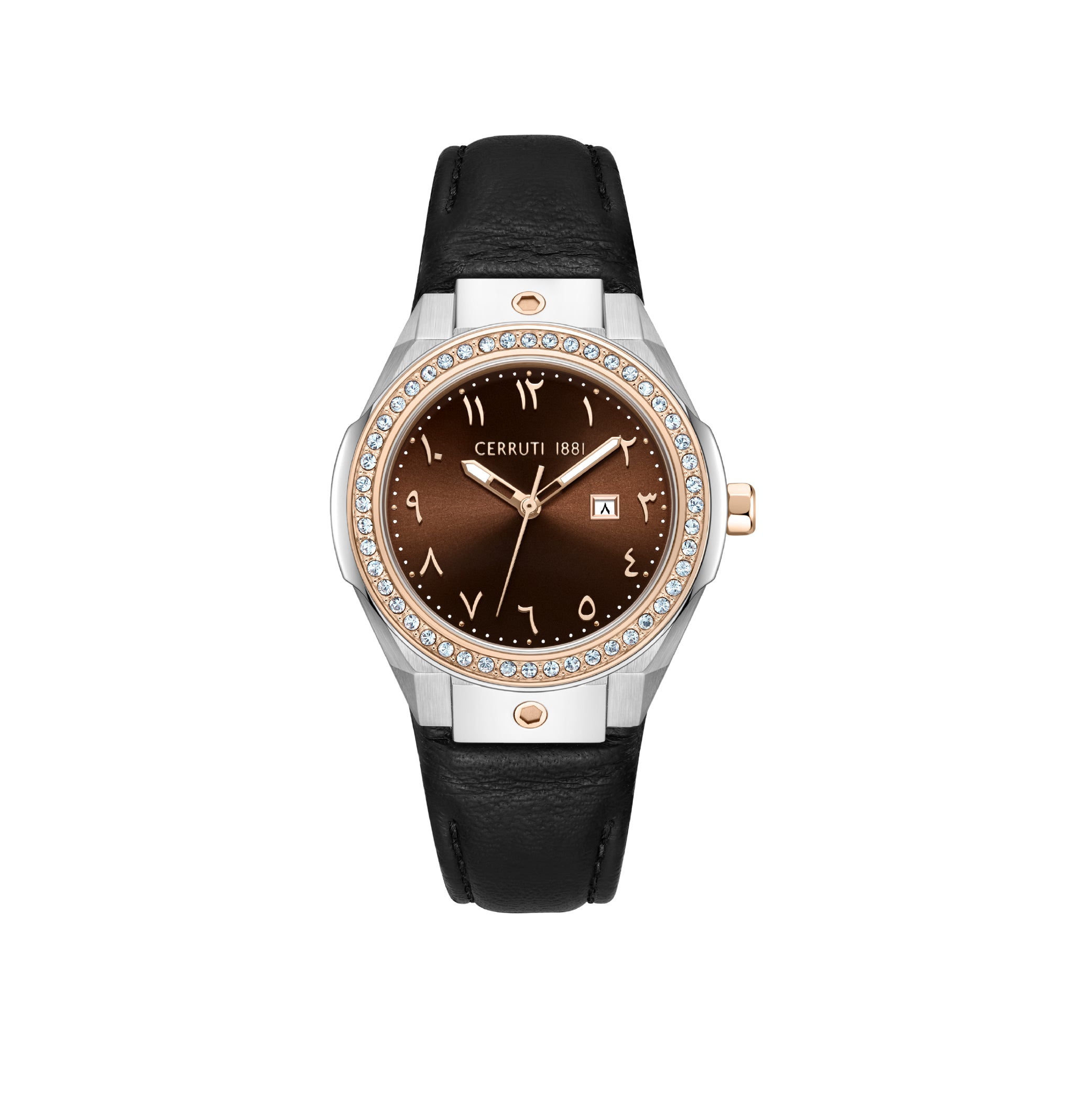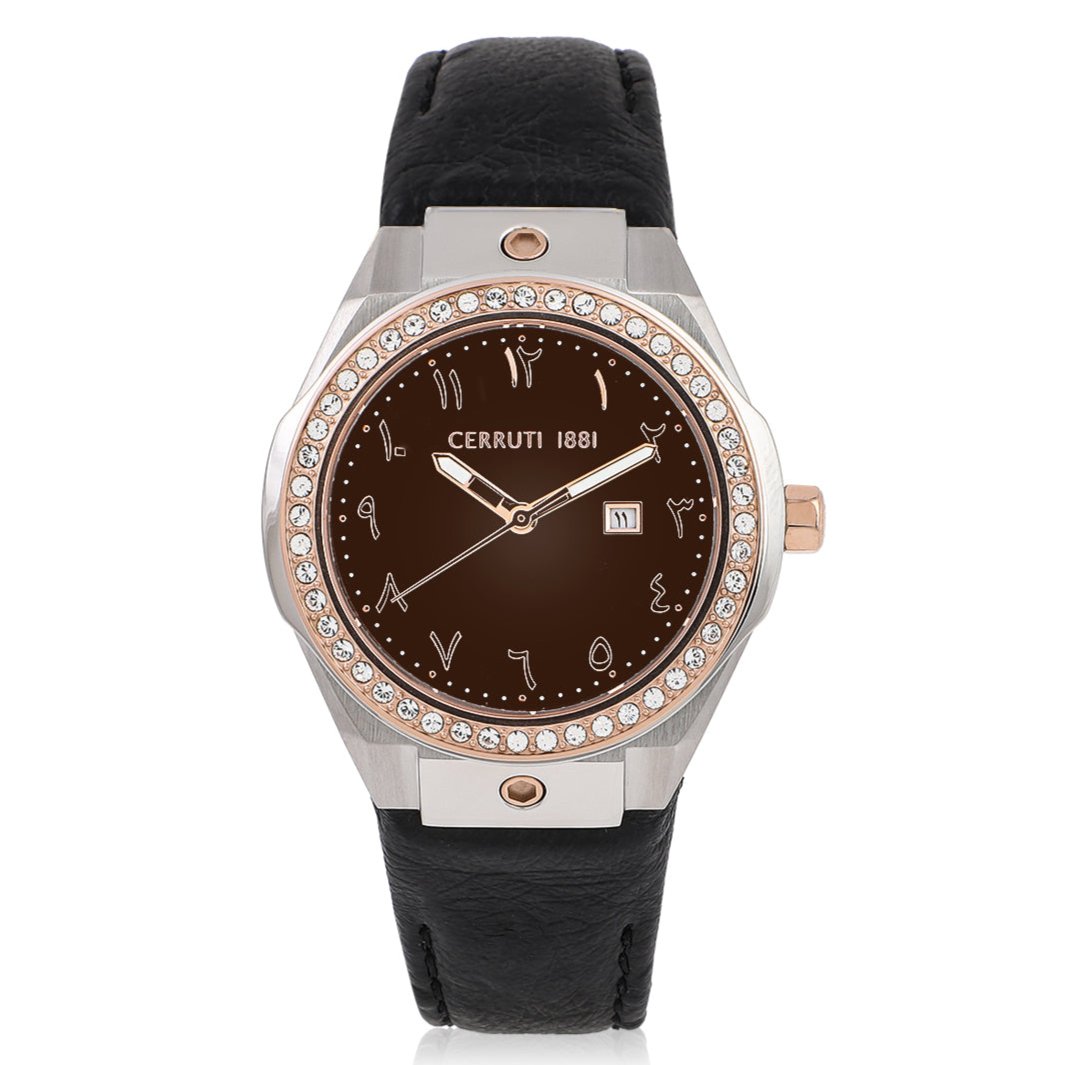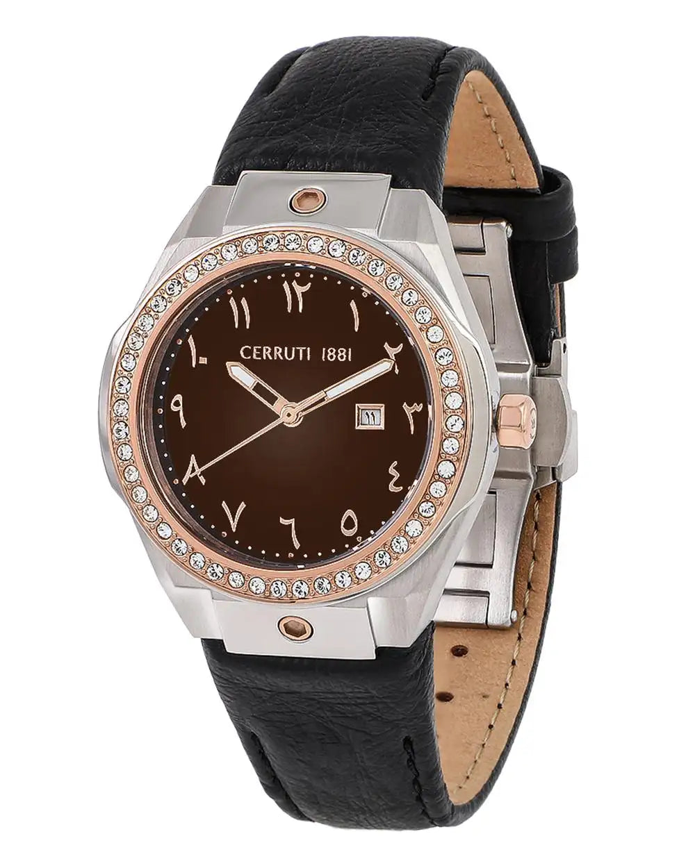 Elevate your style with the Cerruti 1881 Ruscello Women's Watch. This elegant timepiece features a captivating brown dial with Arabic numerals and sparkling crystals, creating a unique and sophisticated look. The two-tone stainless steel case and black leather strap add a touch of luxury. Powered by precise quartz movement, this watch ensures accurate timekeeping.