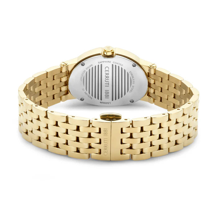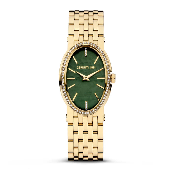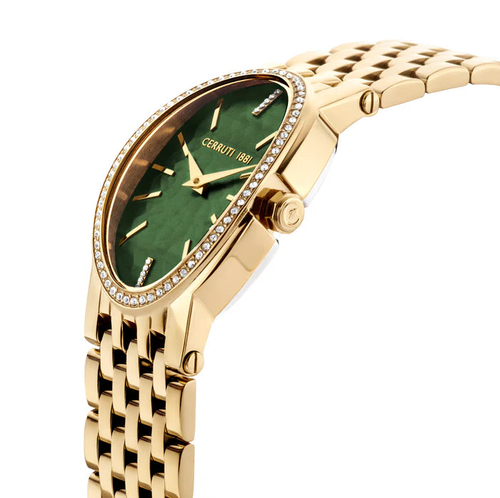 This Cerruti 1881 NORCIA CIWLG0008804 JEWELLERY Women watch is an elegant timepiece with a 2 hand movement and 9T22 case size of 28x46mm. It is crafted from polished and brushed gold plated material with a crystalized topring and a curved glass dial. The dial features a green 553C hammered design with gold plated and crystal indexes. It has a 20mm gold plated bracelet with a push button deployment, a 5 ATM water resistance and is decorated with stones.