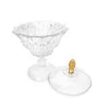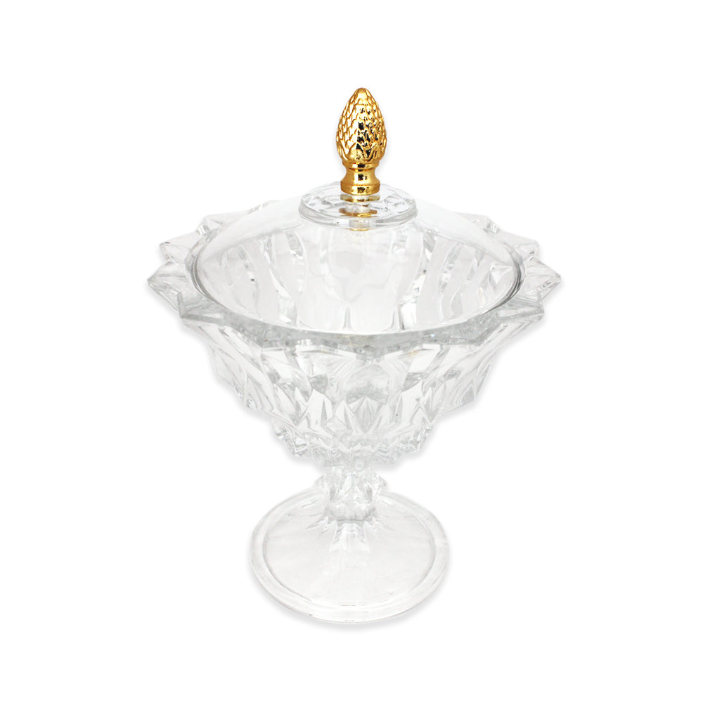 This candy box brings joy chic round hand cut crystal design combines with exquisite diamond-like cuts all around the base will make guests break their diets and dig in for a morsel of the sweet stuff makes the perfect accessory to fancy dinner parties .