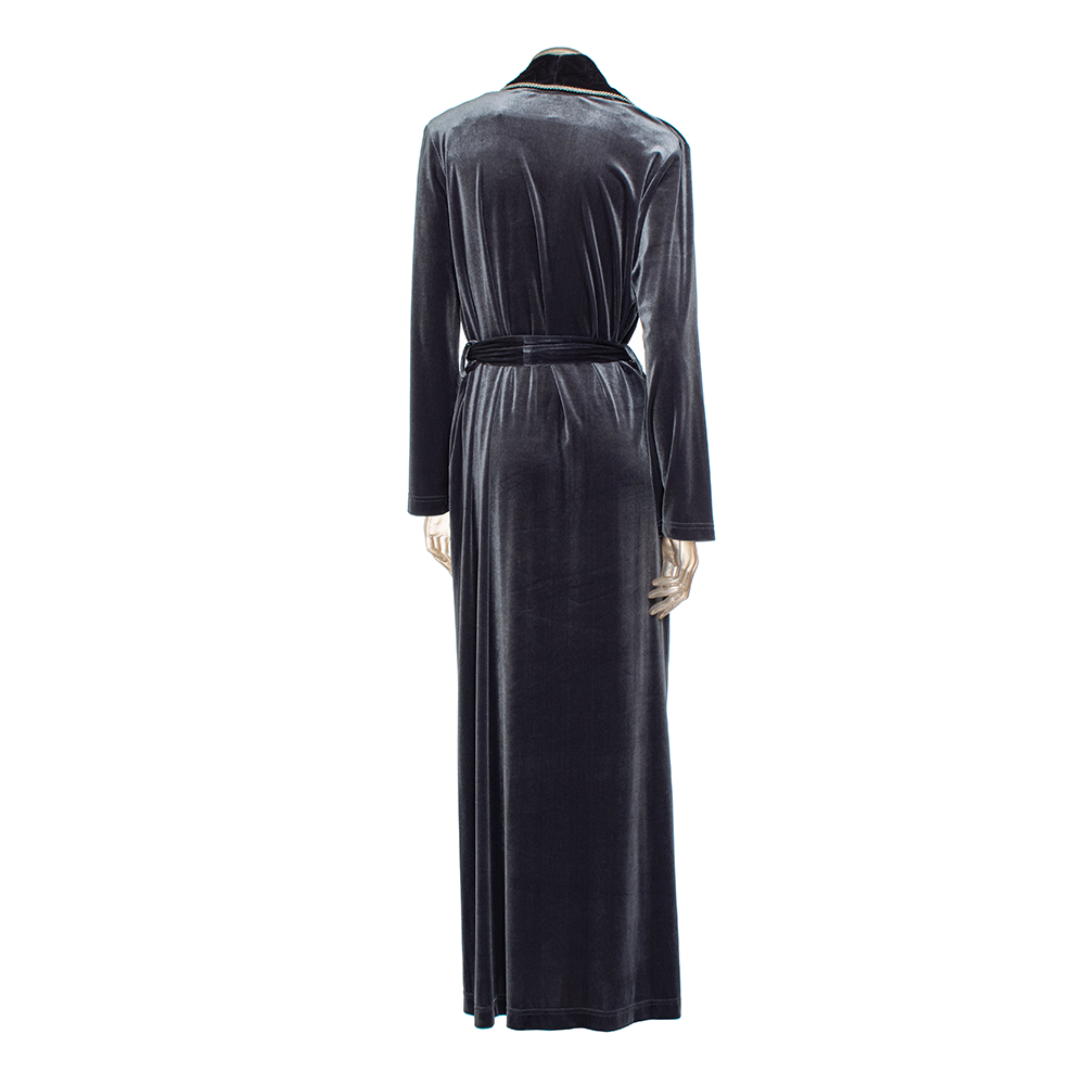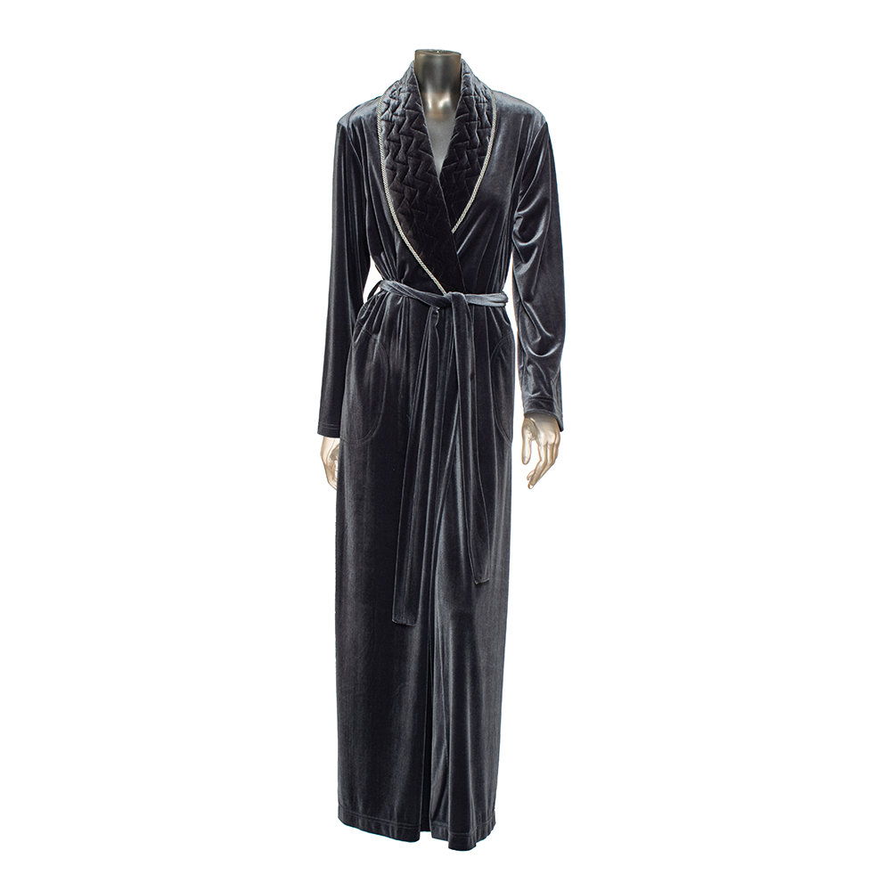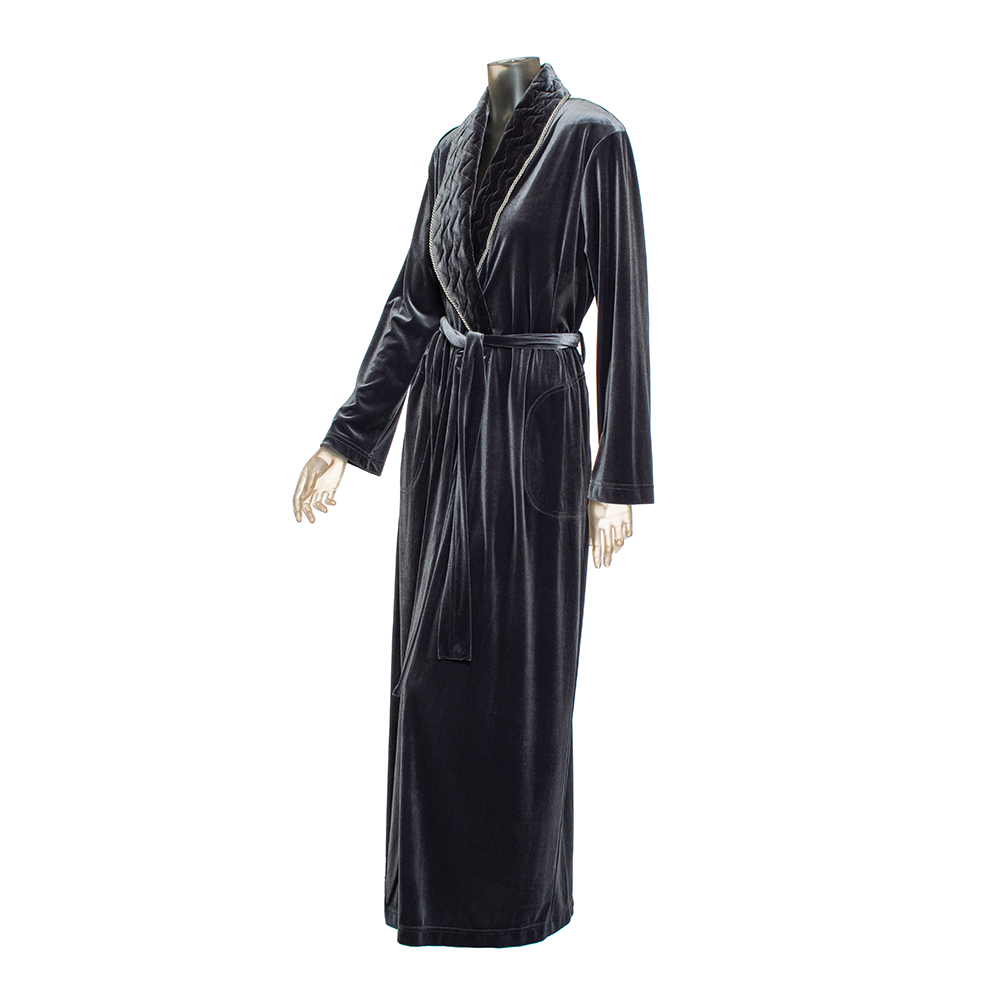 Soft long velvet defines an opulent shawl-collar robe elegantly framed with quilted trim. It has sash-tie closure that help secure a perfect fit with a side pocket detail.