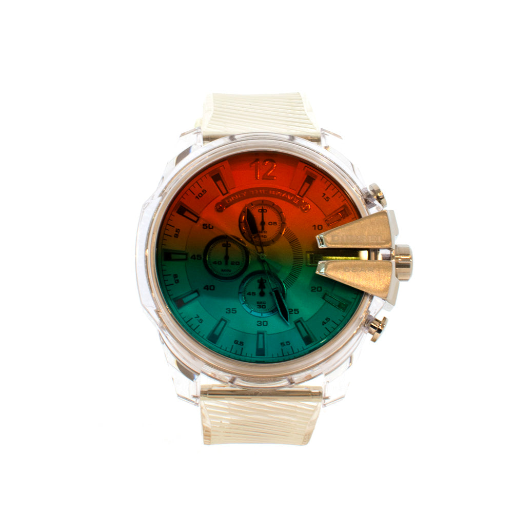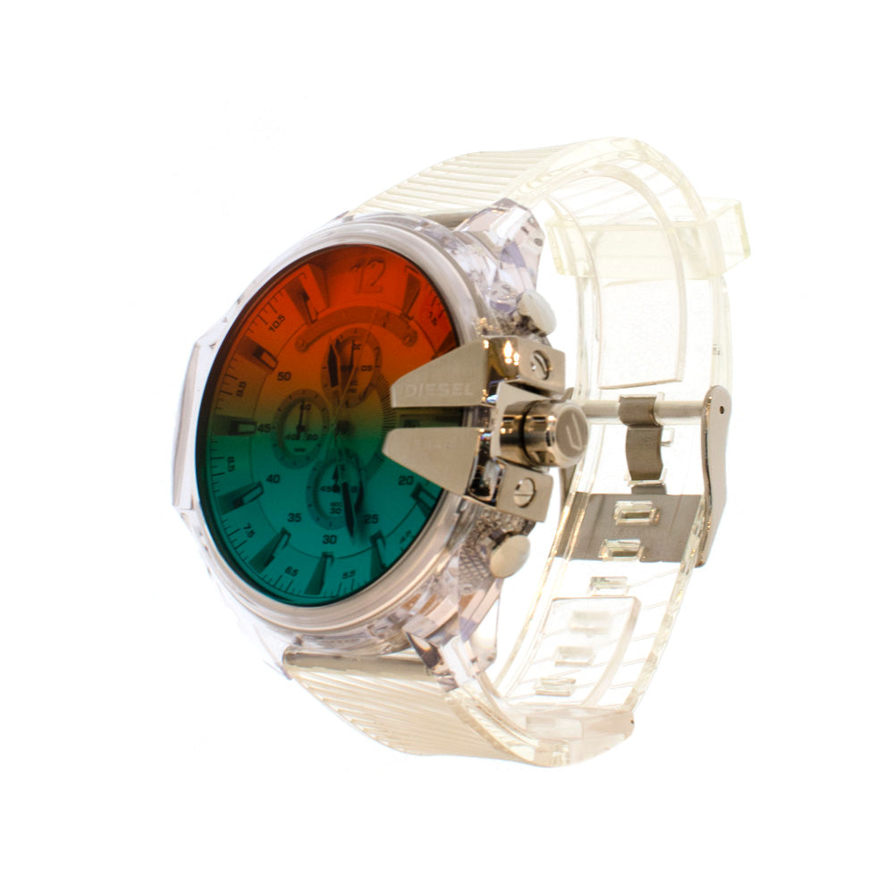 Diesel mens watch, plastic strap and case, chronograph, sunset with ocean color dial