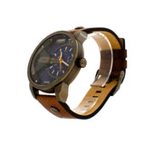 Diesel mens watch with 2 time zone, dark brown leather strap, blue dial,gun metal case