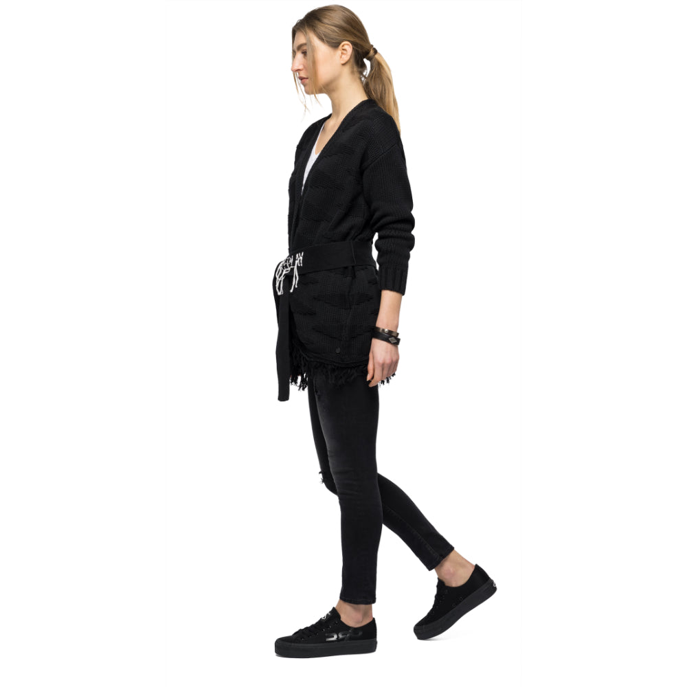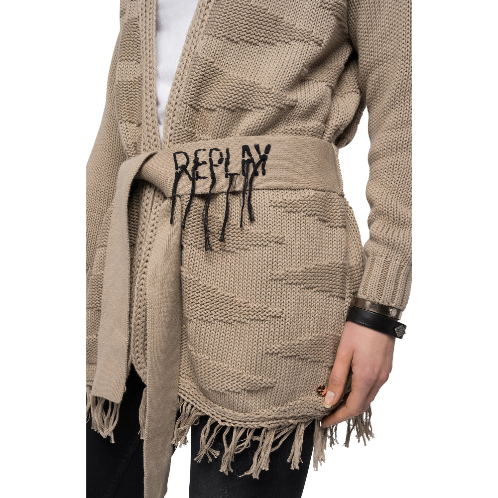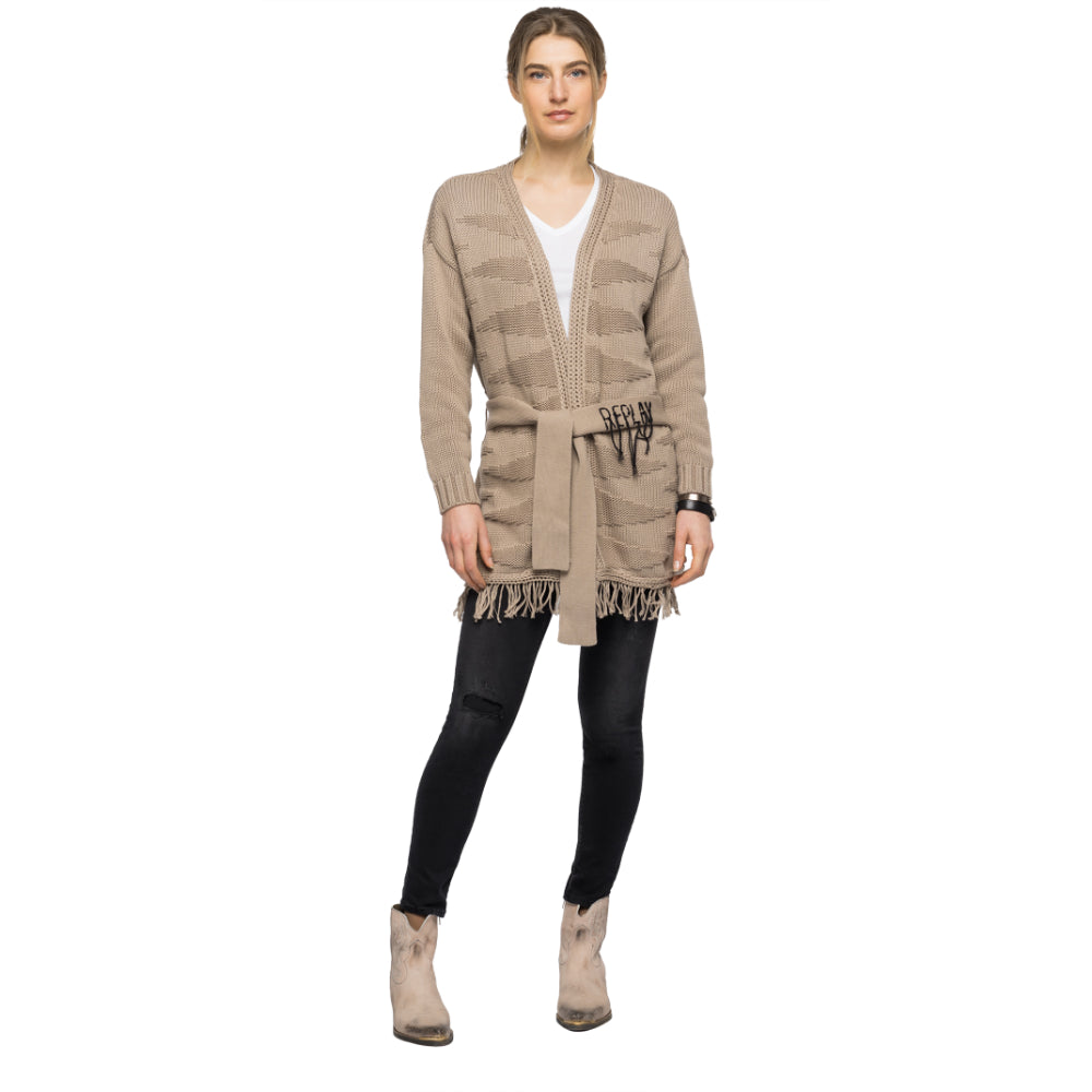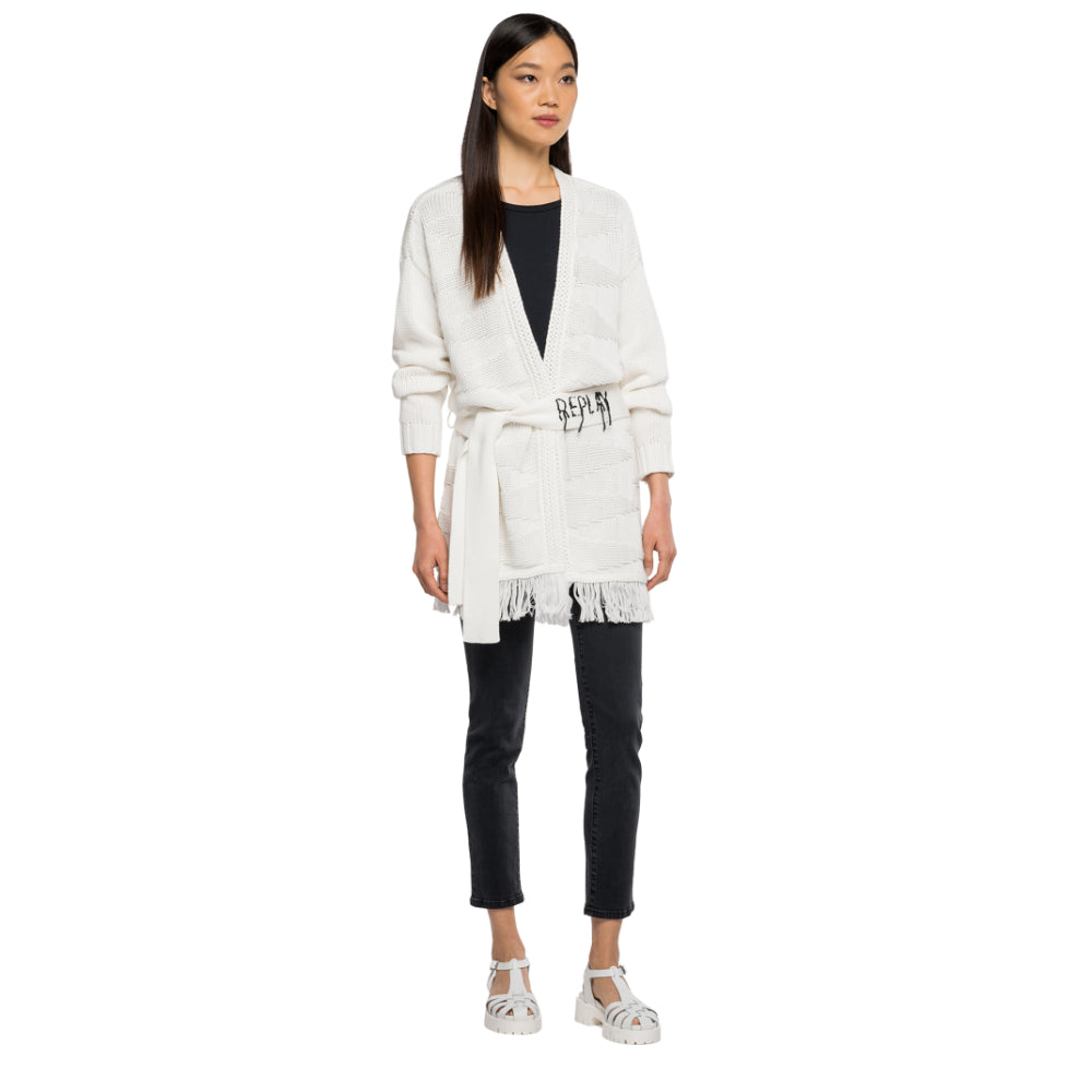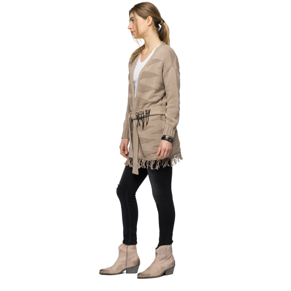 Women's open cardigan in solid-coloured cotton, regular fit with long sleeves and slightly dropped shoulders, elasticated rib on the cuffs, REPLAY logo embroidered with fringes at the back, tone-on-tone belt tied at the waist, REPLAY customized metal plate at the front of the hem, hem with fringes.