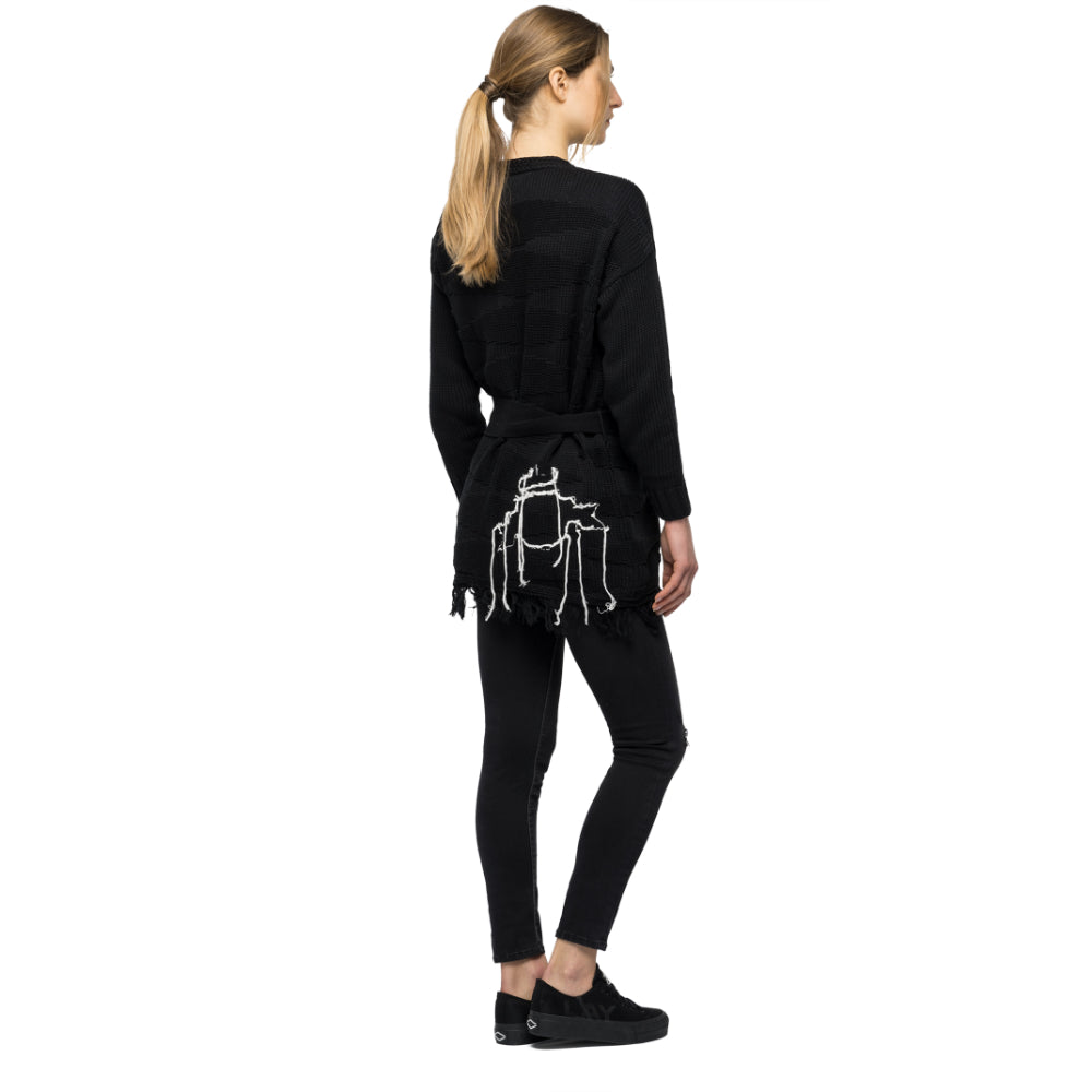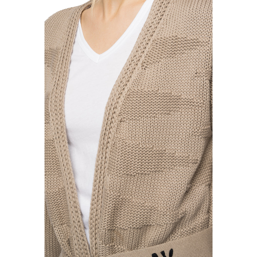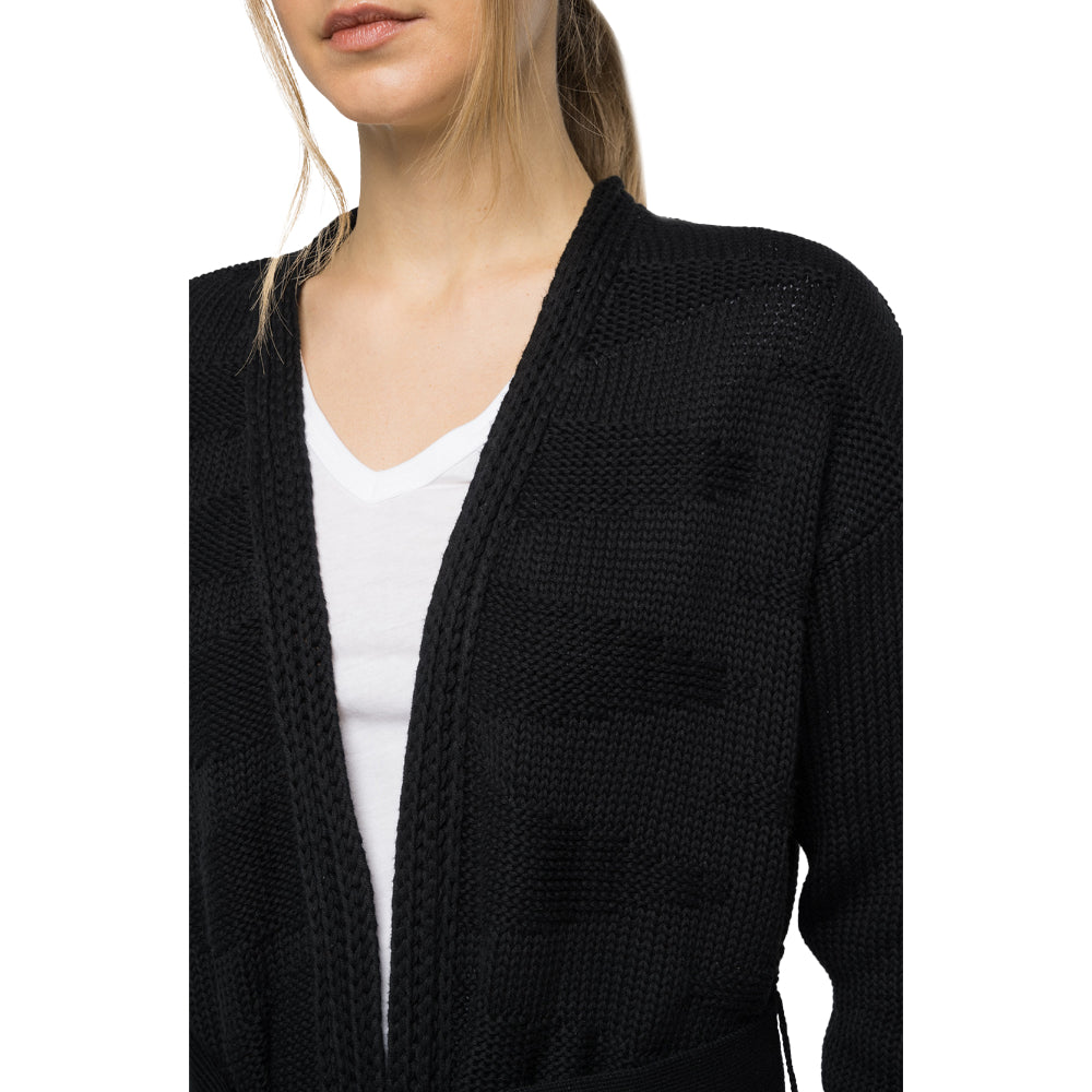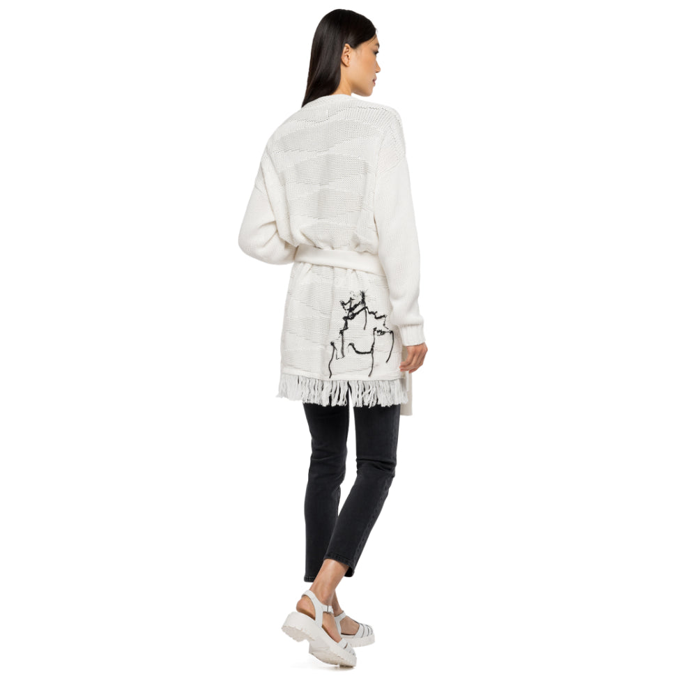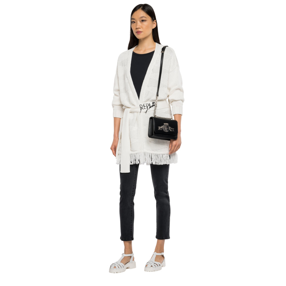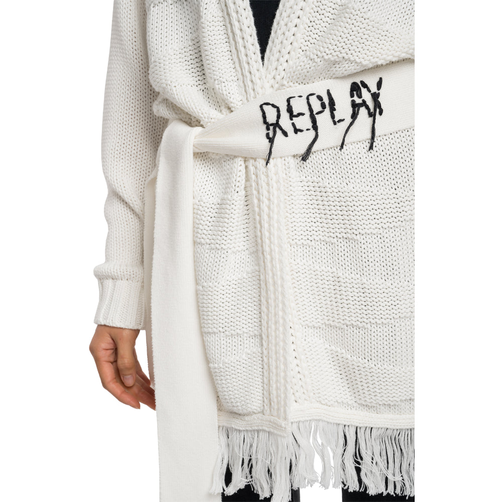 Women's open cardigan in solid-coloured cotton, regular fit with long sleeves and slightly dropped shoulders, elasticated rib on the cuffs, REPLAY logo embroidered with fringes at the back, tone-on-tone belt tied at the waist, REPLAY customized metal plate at the front of the hem, hem with fringes.