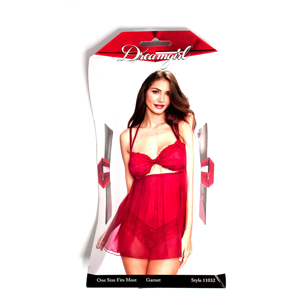 Stretch lace and stretch mesh babydoll with scalloped lace neckline detail and adjustable halter & shoulder straps. Matching lace tanga panty included.