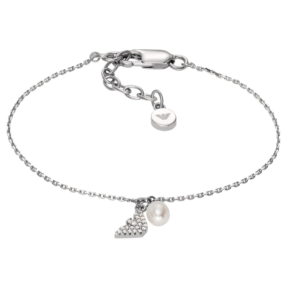 • Adorning the bracelet are two charms. One takes the shape of Emporio Armani's iconic eagle logo and is set with cubic zirconia crystal detailing, whilst the other is a freshwater pearl