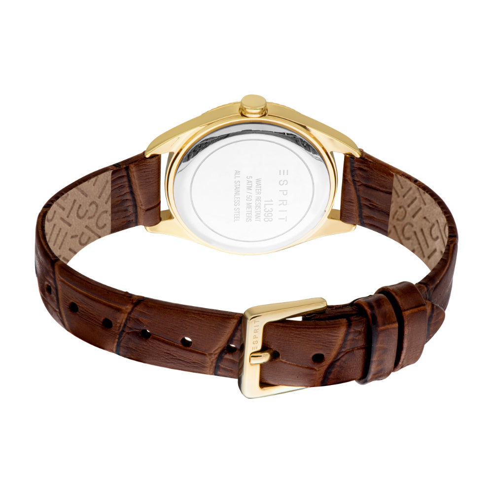 ESPRIT Women's Gold Color Case Watch with Silver Dial and Dark Brown Leather Strap
