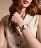 | The Fossil Carlie Ladies Three-Hand Stainless Steel Watch is a chic and elegant timepiece that beautifully marries vintage charm with contemporary design. Inspired by the timeless aesthetics of the '90s, this watch features a redesigned T-bar that adds a subtle nod to classic styles while embracing modern elegance. The watch is housed in a 28MM stainless steel case, providing a durable and polished finish that exudes sophistication and versatility. This stylish case frames a captivating silver sunray dial, which is adorned with luminous hands for easy readability in various lighting conditions. The harmonious blend of Roman numerals and stick indices adds a touch of traditional elegance, offering a balanced and refined appearance on the wrist. One of the standout features of the Carlie watch is its newly designed bracelet, which complements the entire look with its sleek and modern design. This bracelet not only enhances the watch's overall aesthetic but also ensures a comfortable fit for everyday wear. With a case water resistance of 5 ATM, this watch is suitable for withstanding splashes and brief submersion in water, making it practical for daily activities.The Fossil Carlie Ladies Three-Hand Stainless Steel Watch is a versatile accessory that seamlessly transitions from day to night, embodying both classic design and modern sophistication. SPECIFICATIONS • Brand: Fossil • Gender: Women • Case Size: 28MM • Movement: Quartz Three-Hand • Platform: CARLIE • Strap Material: Stainless Steel • Strap Color: Silver • Case Water Resistance: 5 ATM • Case Material: Stainless Steel • Case Color: Silver • Dial Color: Silver • Strap Fashion Color: Silver-Tone • Strap Width: 12MM • Closure: Adjust-O-Matic • Strap Inner Circumference: 185+/- 5MM • Crystal Type: Mineral • Battery Type: SR621SW About Brand Fossil is an American fashion and lifestyle brand that primarily sells watches, jewelry, and leather goods. It was founded in 1984 and is headquartered in Richardson, Texas. The brand is known for its modern yet vintage-inspired designs, drawing inspiration from classic American style with a modern twist. They offer a wide range of products for both men and women, including watches with interchangeable straps, customizable jewelry, and high-quality leather bags and accessories. |