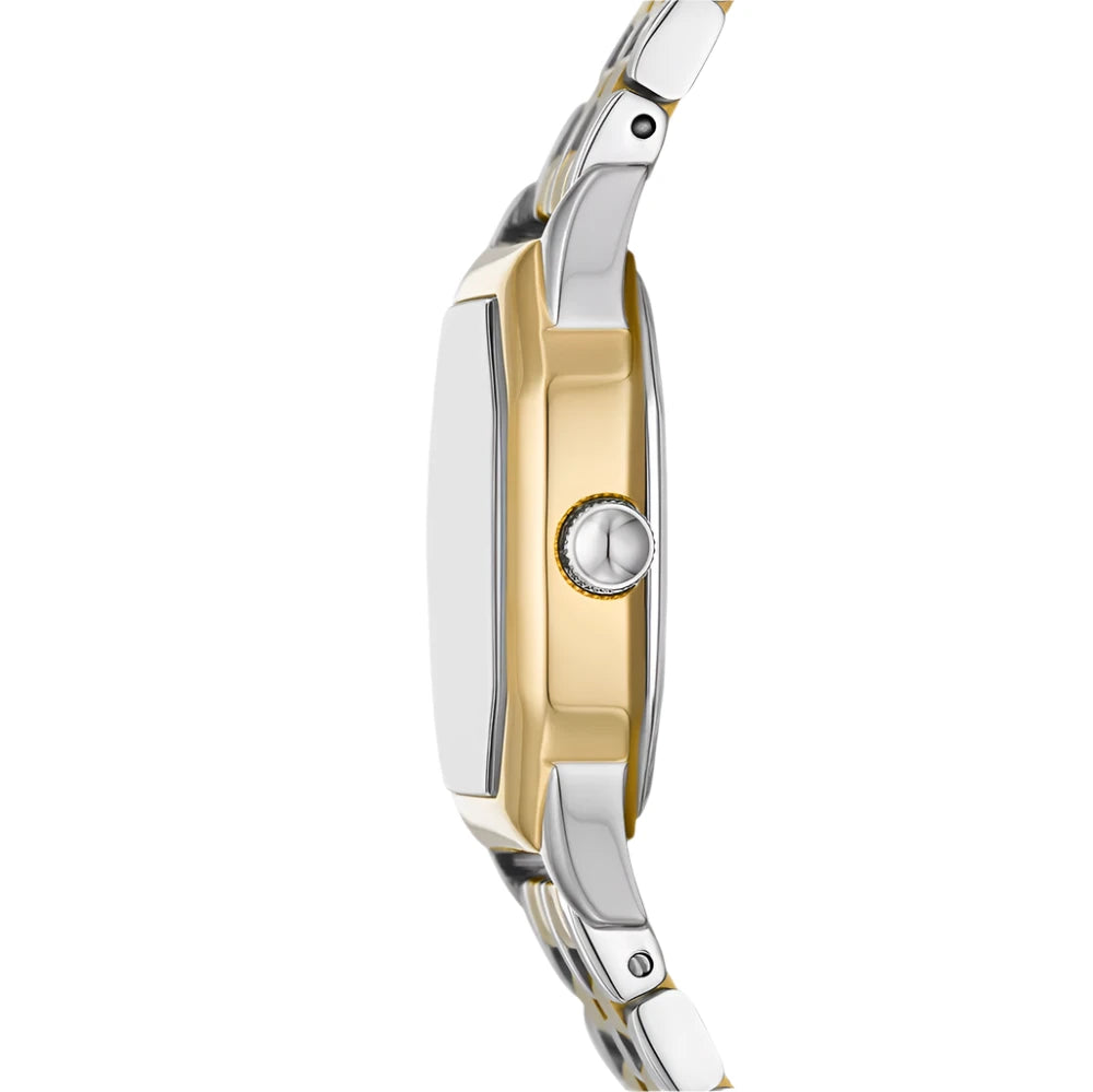 The Fossil Harlow Ladies Three-Hand Two-Tone Stainless Steel Watch is a stunning timepiece that combines vintage details with modern design. Featuring an archival style, this watch is perfect for those who appreciate a touch of nostalgia. The watch is made from durable stainless steel and features a five-link bracelet with a two-tone finish, adding elegance and sophistication to the overall look. The octagonal-shaped case adds a unique touch to the design, making it stand out from other watches. The textured cream dial adds a touch of texture and visually complements the overall design of the watch. The three-hand movement ensures accurate timekeeping, making it a reliable accessory for everyday wear. With a water resistance of 3 ATM, this watch is suitable for everyday use and can withstand minor water exposure, such as splashes and rain. The Fossil Harlow Ladies Three-Hand Two-Tone Stainless Steel Watch is a stylish and functional accessory that will elevate any outfit.