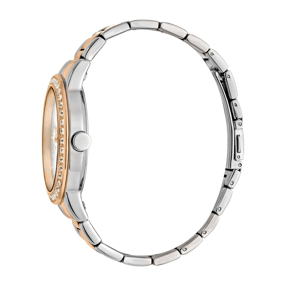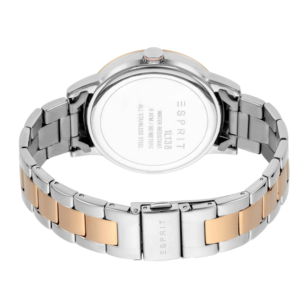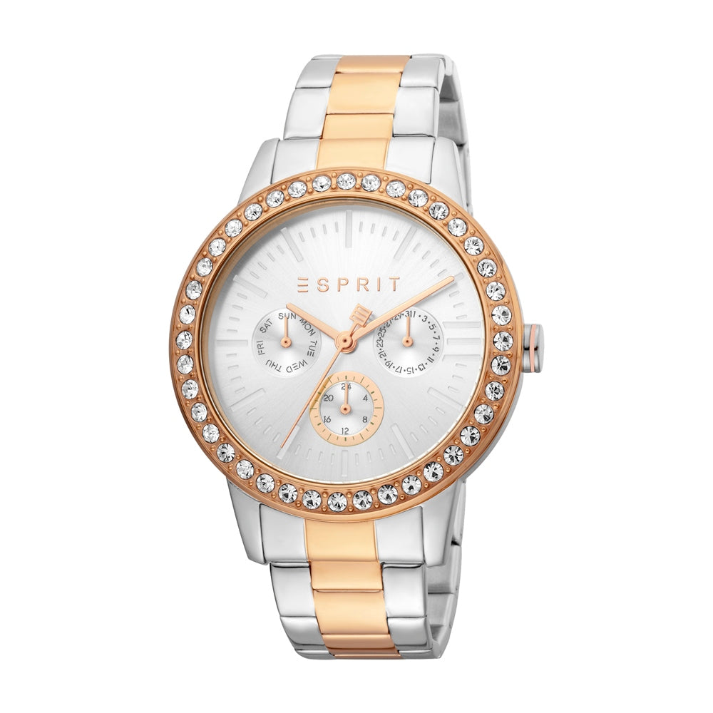 Esprit watch ladies rosegold & silver case & bracelet with stone & multi function silver dial