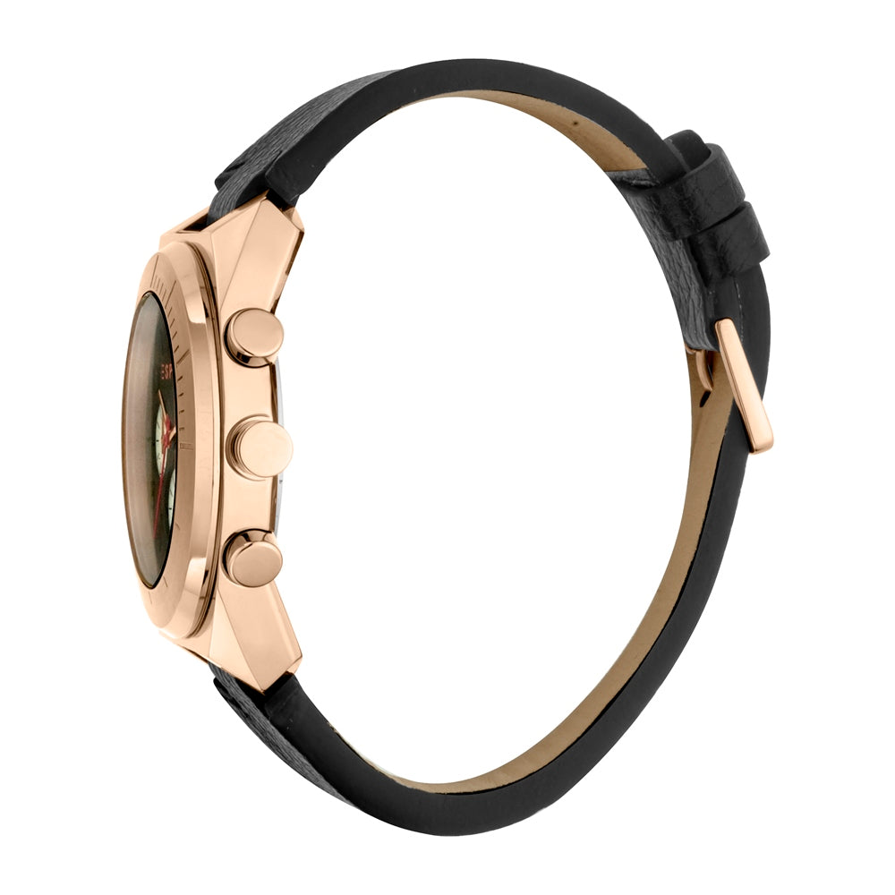Esprit watch mens black leather strap rosegold case stainless steel chronograph black dial with date
