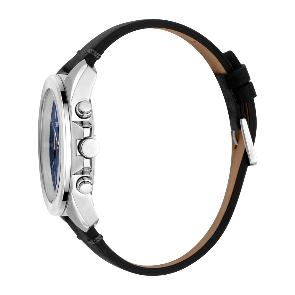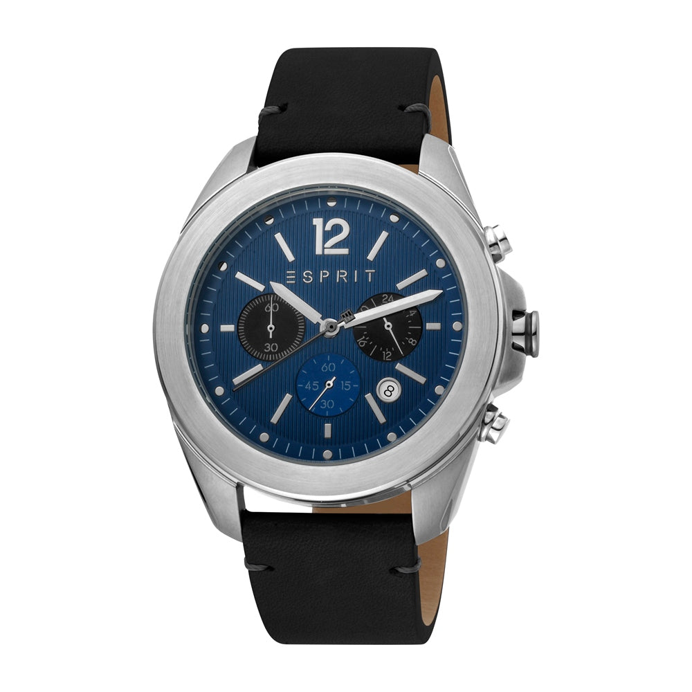 Esprit Men's Chronograph Watch Black Leather Strap Blue Dial With Date