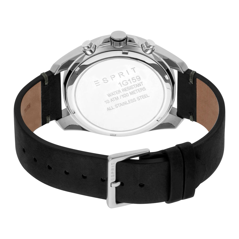 Esprit watch mens black leather strap silver case blue dial chronograph with date