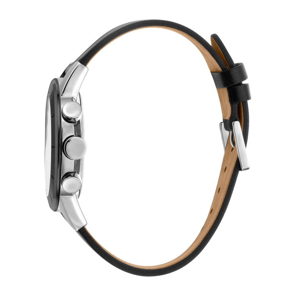 Esprit watch mens black leather strap stainless steel silver/black case chronograph white dial with date