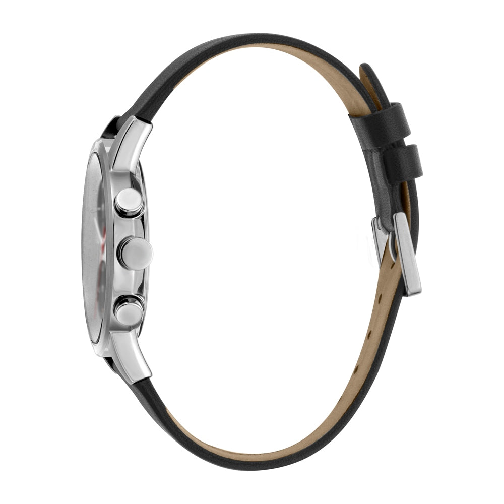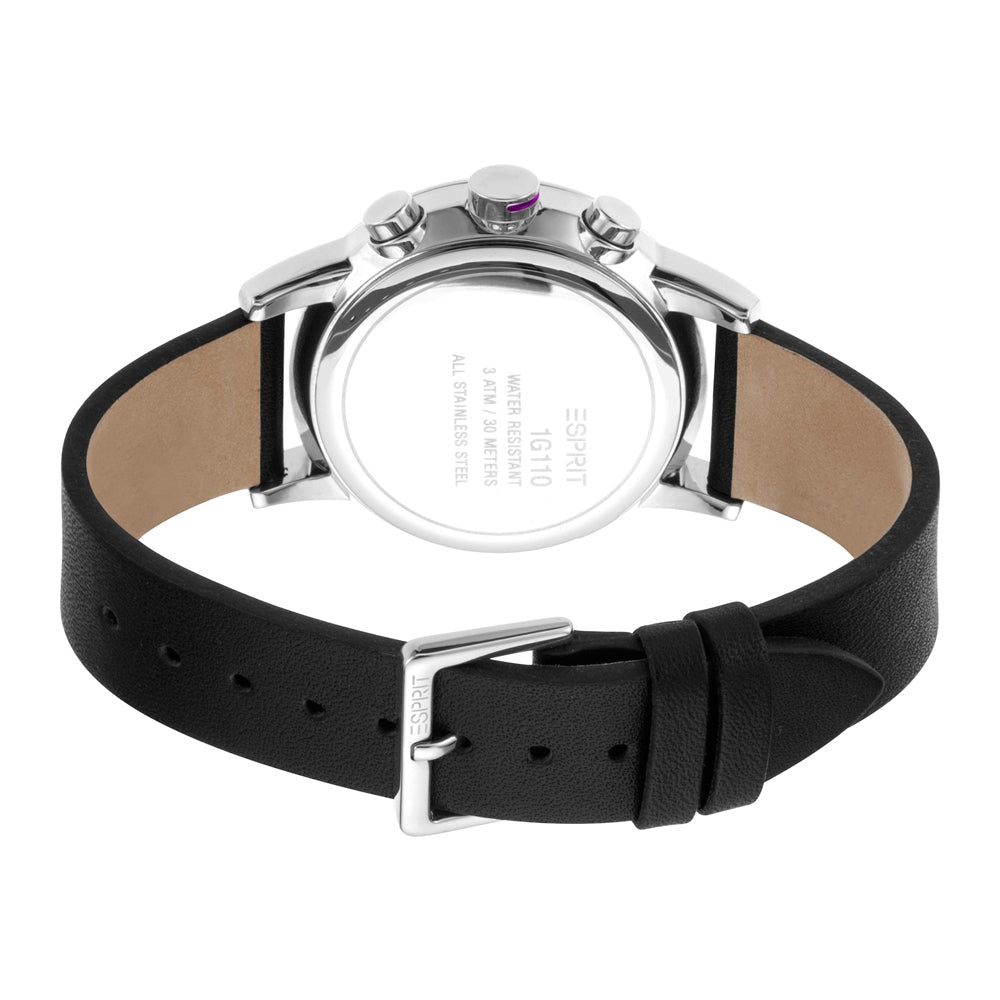 Esprit watch mens black leather strap stainless steel silver case chronograph white dial with date