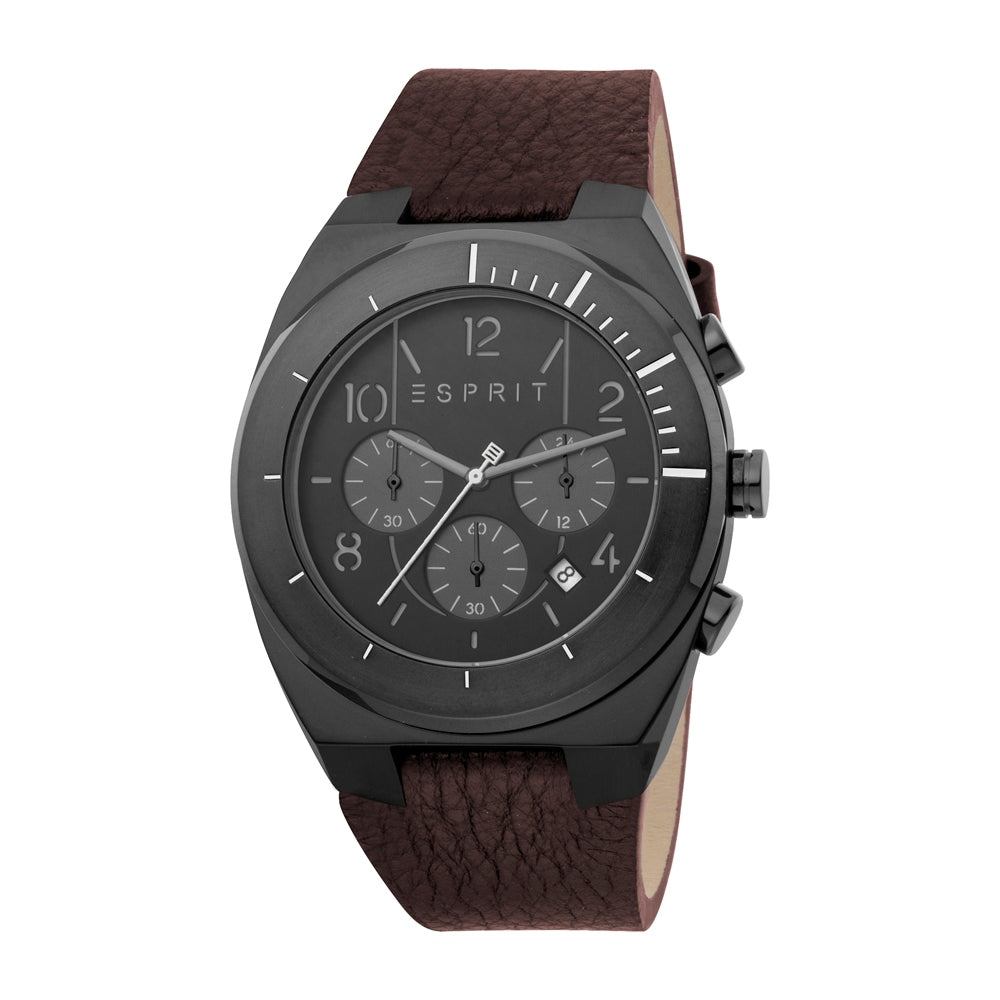 Esprit watch mens brown leather strap black case stainless steel chronograph black dial with date