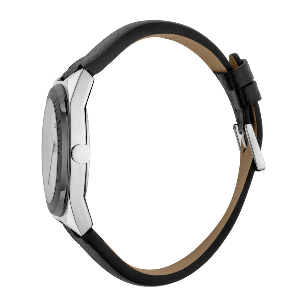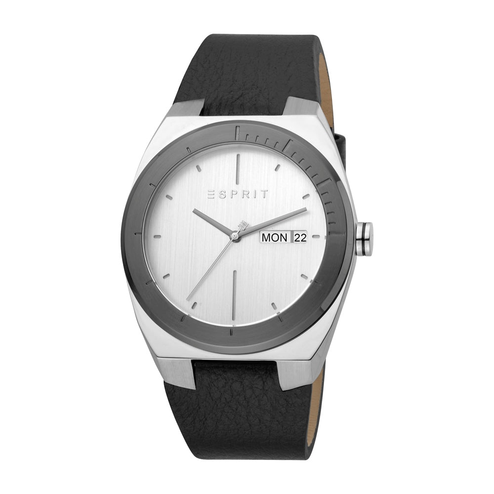 Esprit Men's Stainless Steel Day Date Watch With Black Leather Strap & White Dial