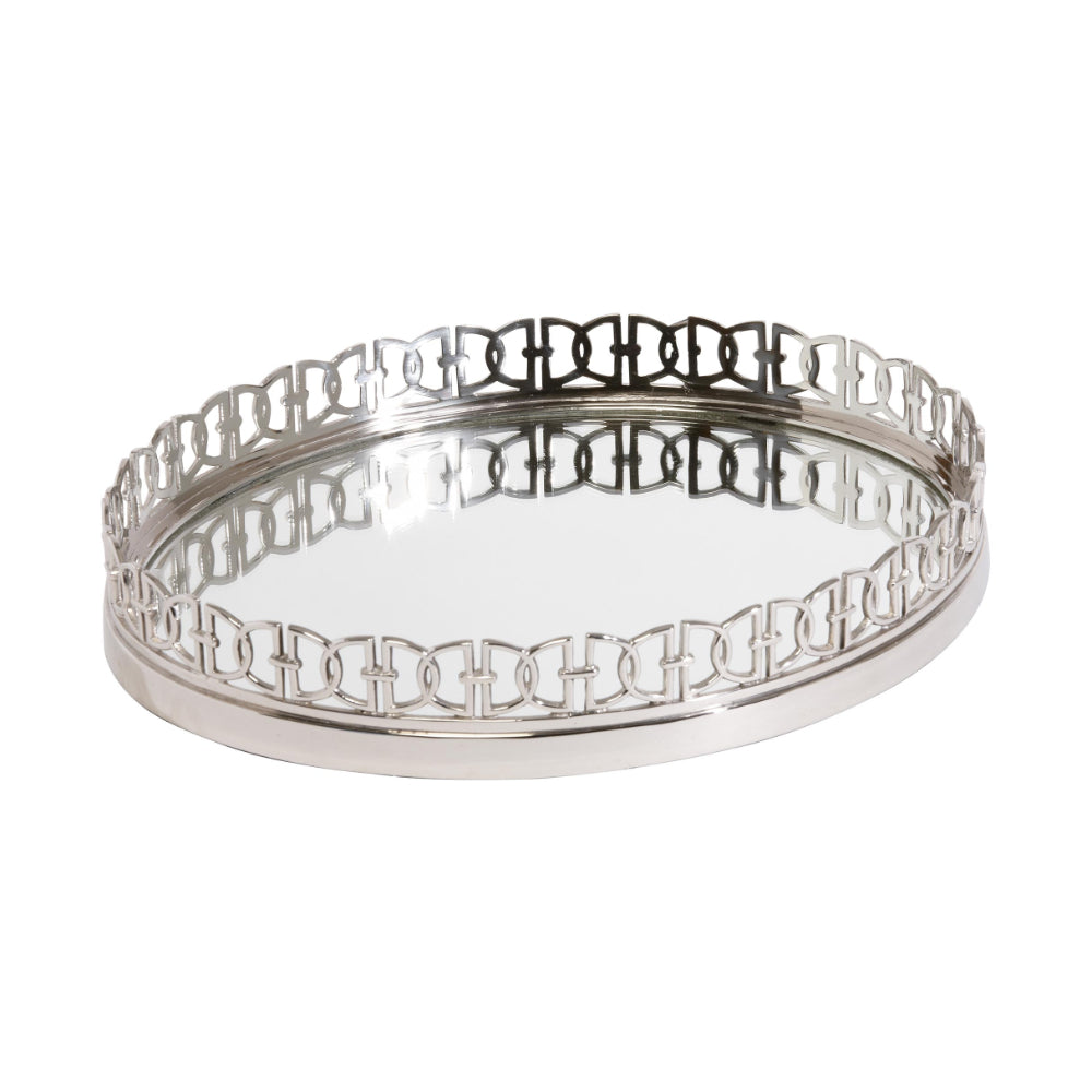 Crafted of brass in India, the tray features a lovely linked design with a nickel finish; the inset mirrored glass gives it even more luster.
