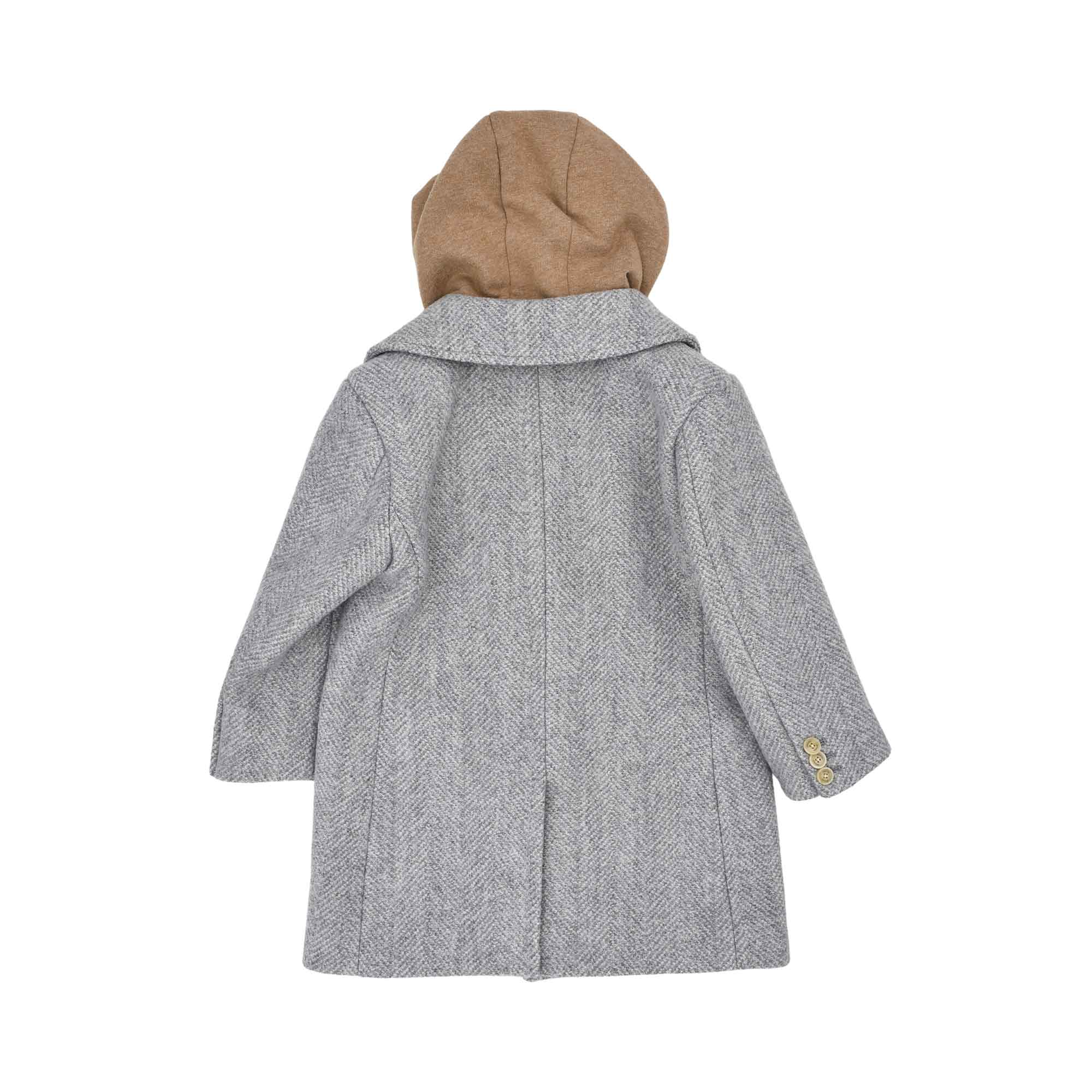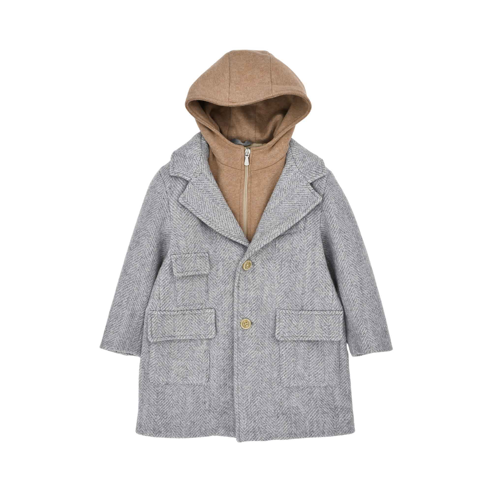 The Eleventy Kids Grey and Beige Jacket with Hood blends refined tailoring with cozy warmth. Designed in Italy, this elegant piece features a layered look combining a classic grey herringbone wool coat with an integrated beige hooded insert — offering both style and practicality.
