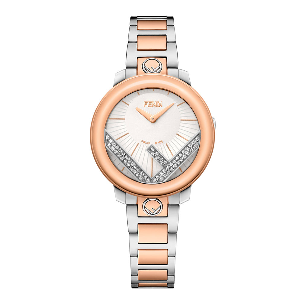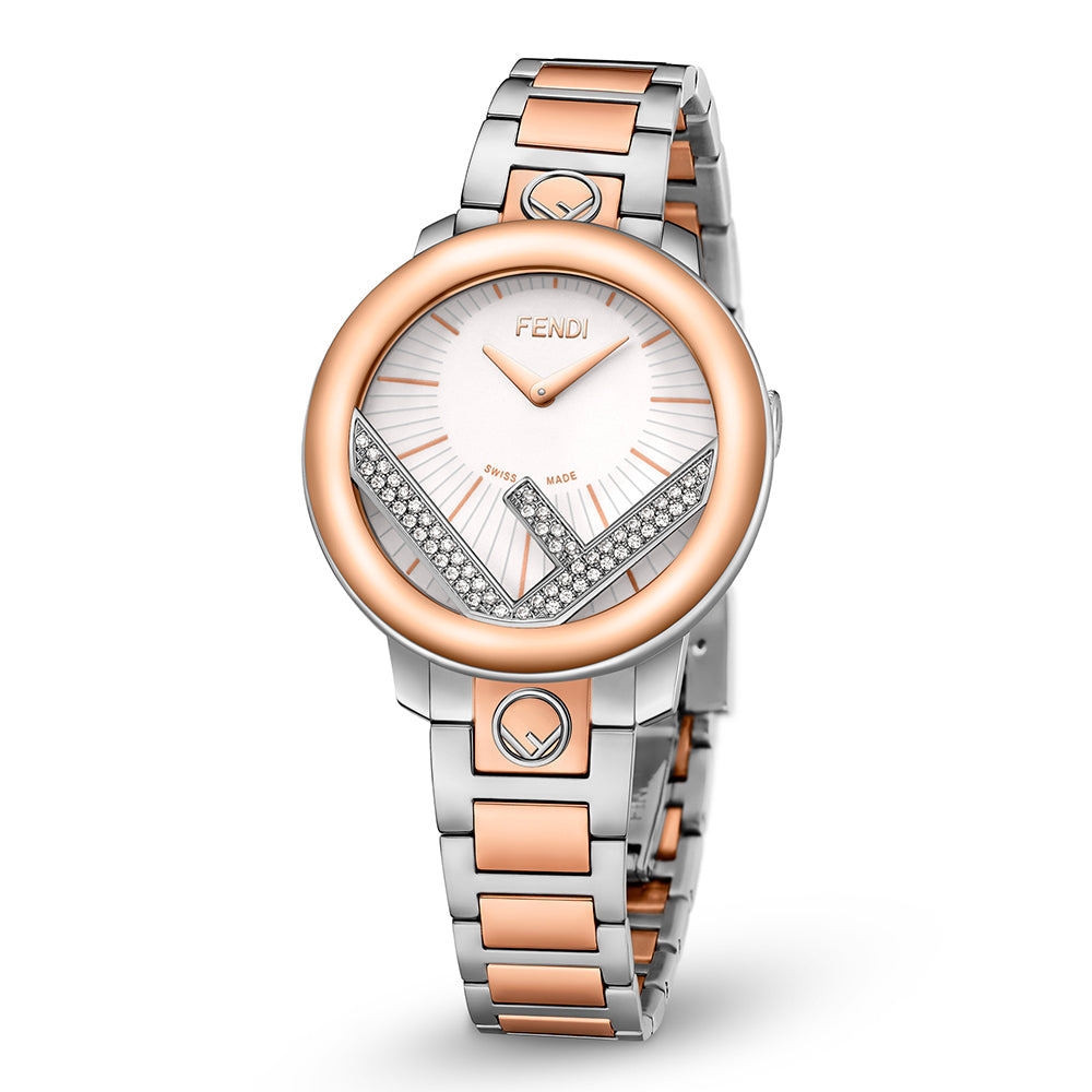 Fendi Timepieces, Run Away, 28 mm stainless steel case with rose gold colored stainless steel bezel and stainless steel F insert set with 57 diamonds (approx. 0.14 carat), sapphire crystal. Curved off-centered silver-white opalin dial with d printed rose gold colored indexes. Stainless steel bracelet with rose gold colored stainless steel central links, applied stainless steel F is Fendi logo at 12 and 6 o’clock, folding buckle. Swiss made quartz movement (hours and minutes). Water resistant to 5ATM (165 feet/50 meters).