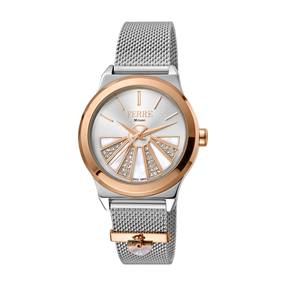 Ferre milano watch silver mesh metal bracelet with silver rosegold case and silver dial with mop and crystal design ladies