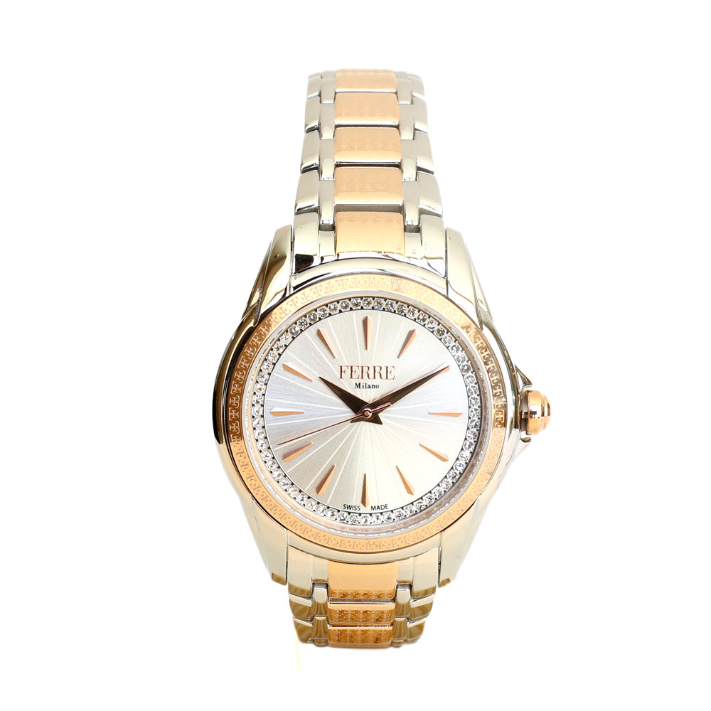 Ferre Milano Ladies Watch Full Stainless Steel Case & Bracelet, Silver/RoseGold Color with Rosegold on Bezel / White Dial & Crystal and Water Resistant 5ATM