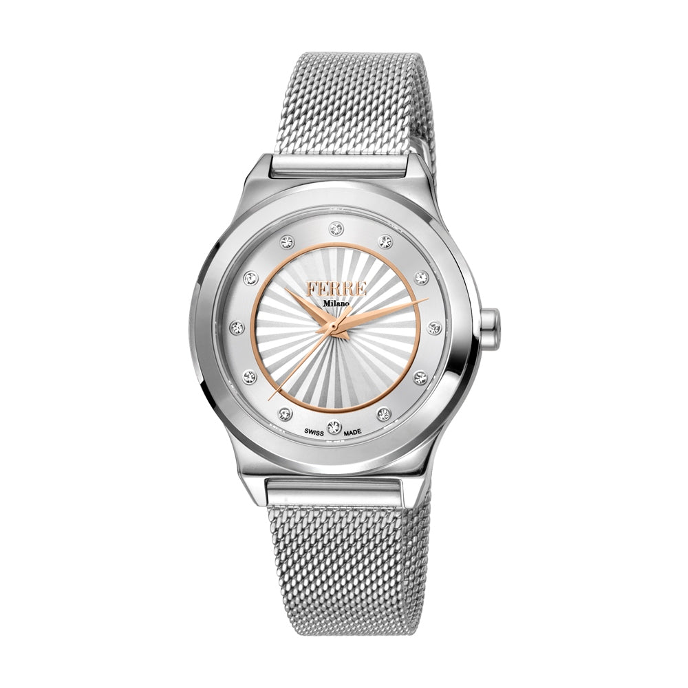 Ferre milano ladie's watch full stainless steel case with silver sun ray dial / stones index & rosegold hands / mesh bracelet and water resistant 5atm