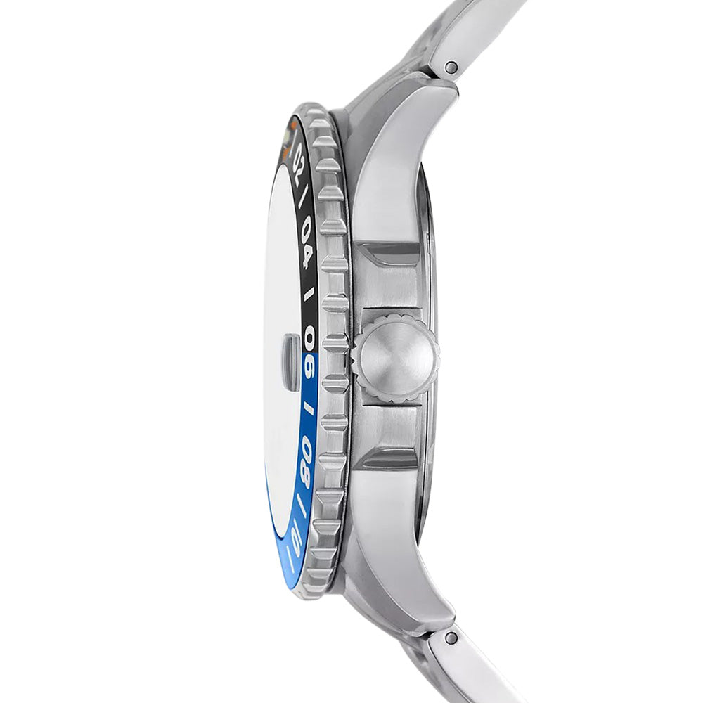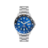 The Fossil Blue GMT Stainless Steel Watch is a stylish and functional timepiece with a case size of 46 mm. It is equipped with a GMT movement, which allows for the tracking of multiple time zones simultaneously. The watch is built on the FOSSIL BLUE GMT platform, ensuring accuracy and reliability. It features a stainless steel strap in a sleek silver color, perfectly complementing the silver case. With a water resistance of 10 ATM, this watch can withstand water pressure up to a depth of 100 meters. The case of the watch is made of stainless steel, which is durable and provides a polished look. The silver case is matched with a striking blue dial, creating a bold and eye-catching contrast. The Fossil Blue GMT Stainless Steel Watch is a versatile and sophisticated timepiece that combines functionality and style. It is perfect for everyday wear and can also elevate any formal or casual outfit.