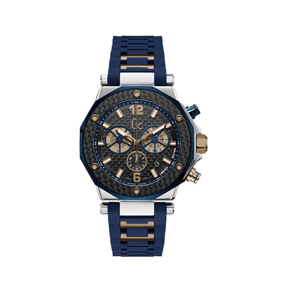 Gc men's watch silver case / blue bezel & black carbon fiber dial with bronze details / chronograph 43 mm with blue silicone strap & bronze pvd inserts / sapphire crystal