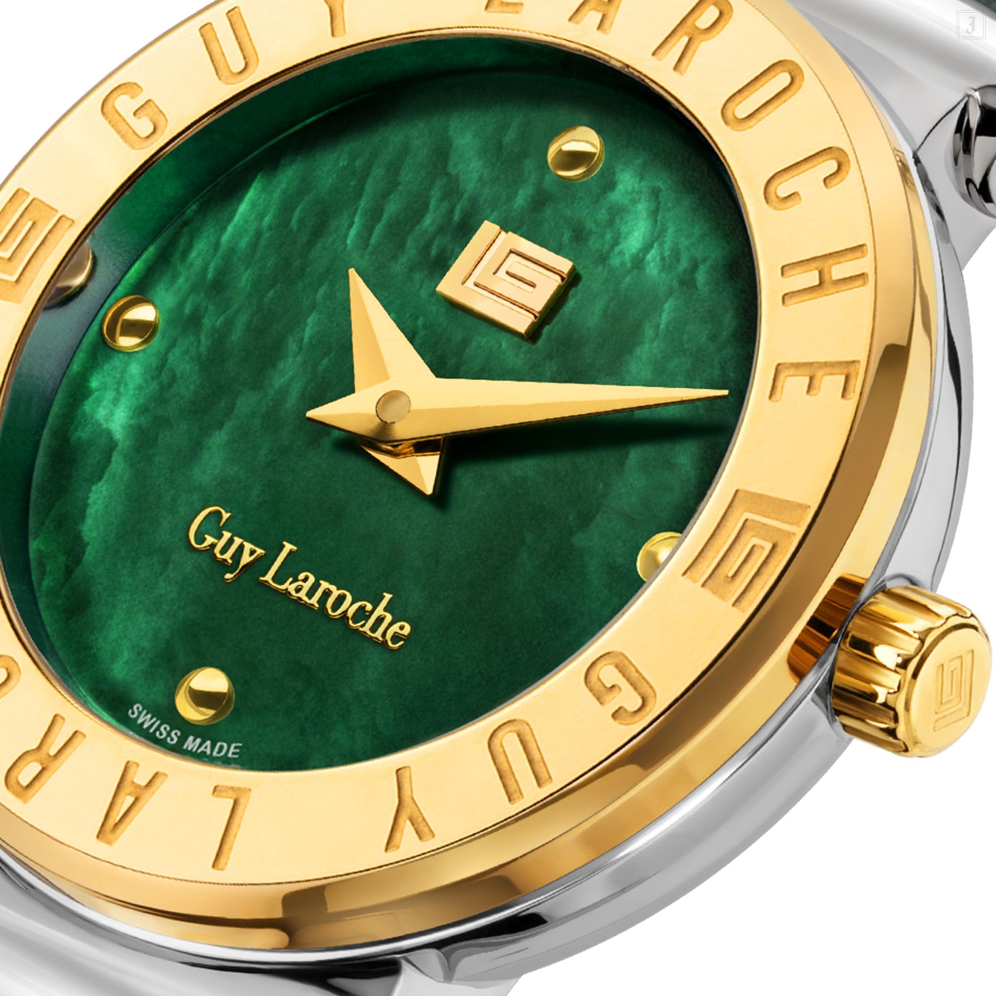 | Tastefully designed and crafted with a truly modern edge, Guy Laroche's Betty is the perfect combination of style and sophistication. From the smooth curves to the green mother of pearl dial, every aspect of Betty exudes elegance and refinement. The iconic 'Guy Laroche' signature on the gold-plated topring coupled with the genuine green leather is sure to turn heads and make a statement. |