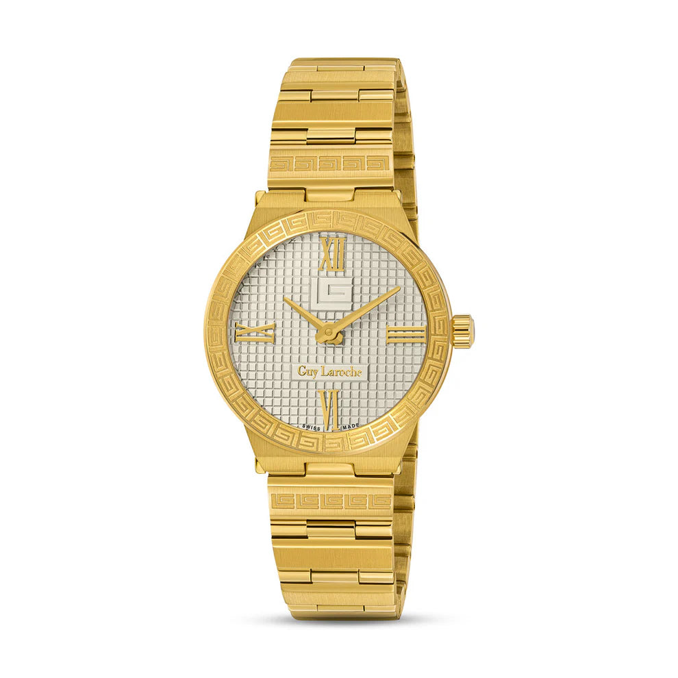 Elevate your style with the Guy Laroche Sacha Watch Set, featuring a sophisticated 25mm watch, a matching gold-plated necklace, and a pair of elegant earrings and a matching gold-plated bracelet. The watch boasts a classic silver dial with gold-plated accents and a comfortable gold-plated bracelet. The necklace features a delicate pendant adorned with shimmering stones, adding a touch of glamour. The earrings complement the set with their matching design and sparkling stones. This exquisite set is perfect for adding a touch of luxury to any outfit.