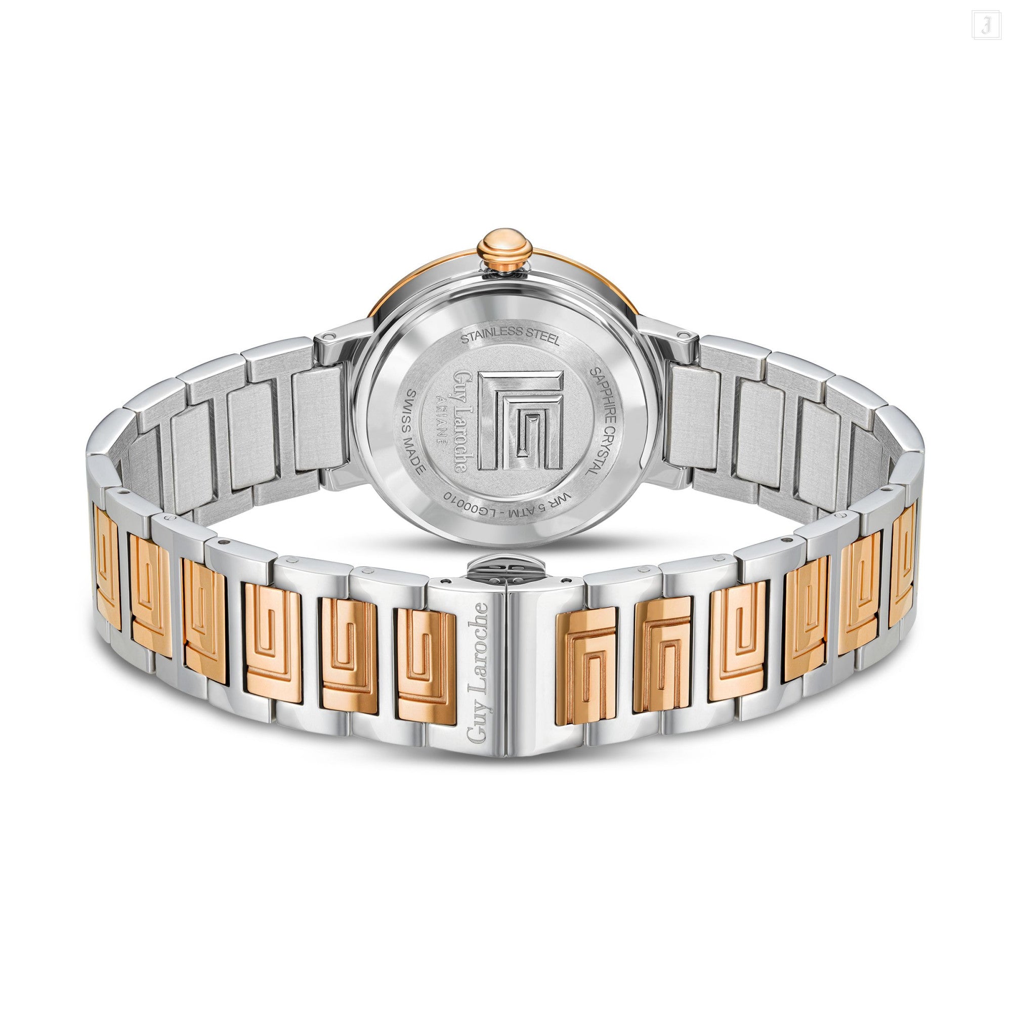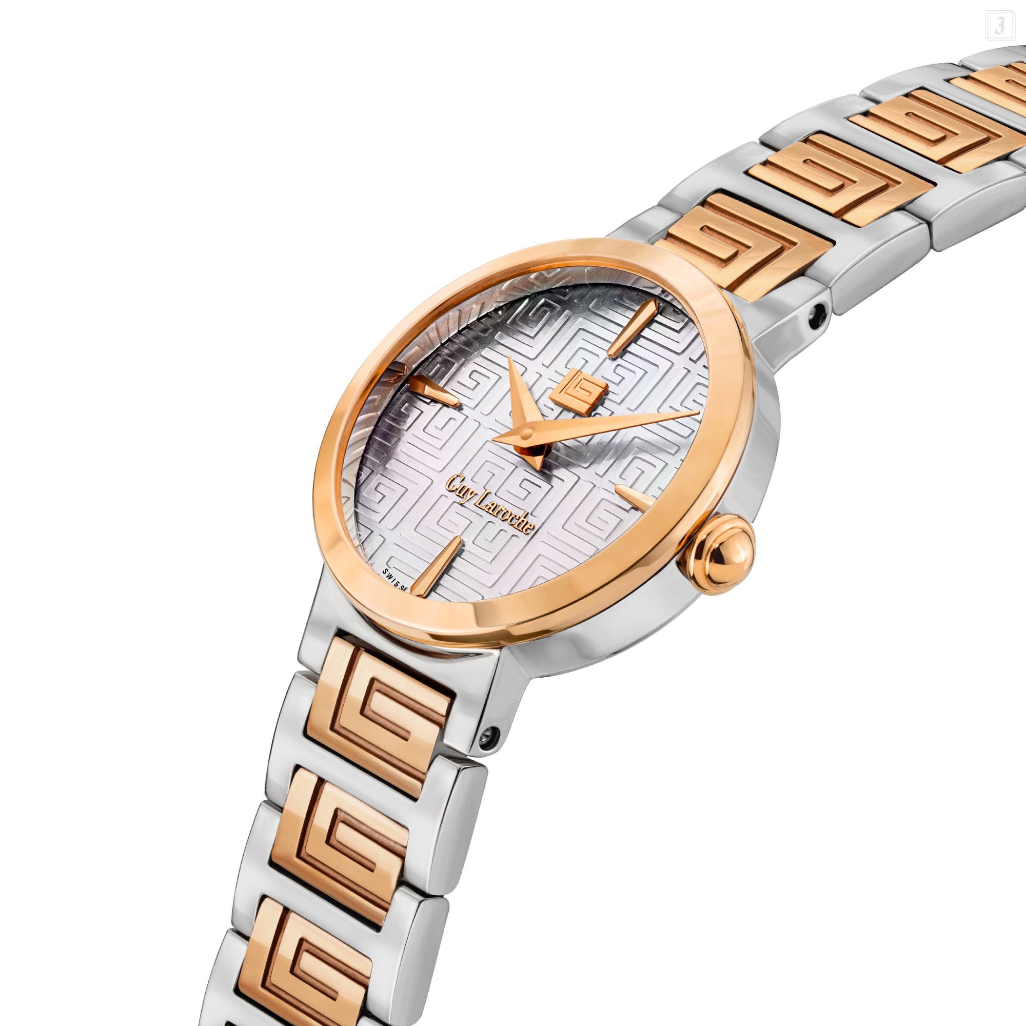 | Guy Laroche seamlessly blends art and design into a stunning timepiece - Ariane. The dual-toned bracelet, adorned with the signature 'GL' logo, and the white mother of pearl dial with the 'GL' monogram, this timepiece emanates sophistication and an etheral allure. |