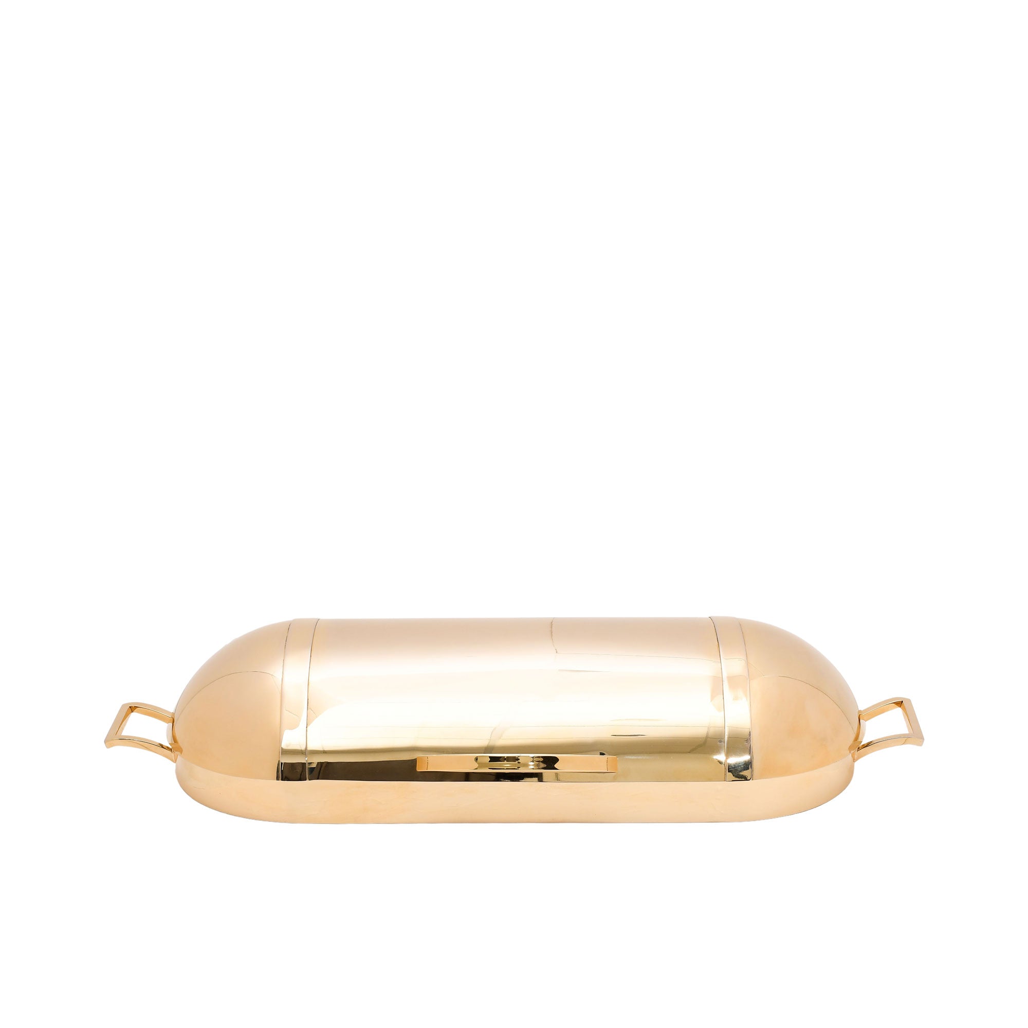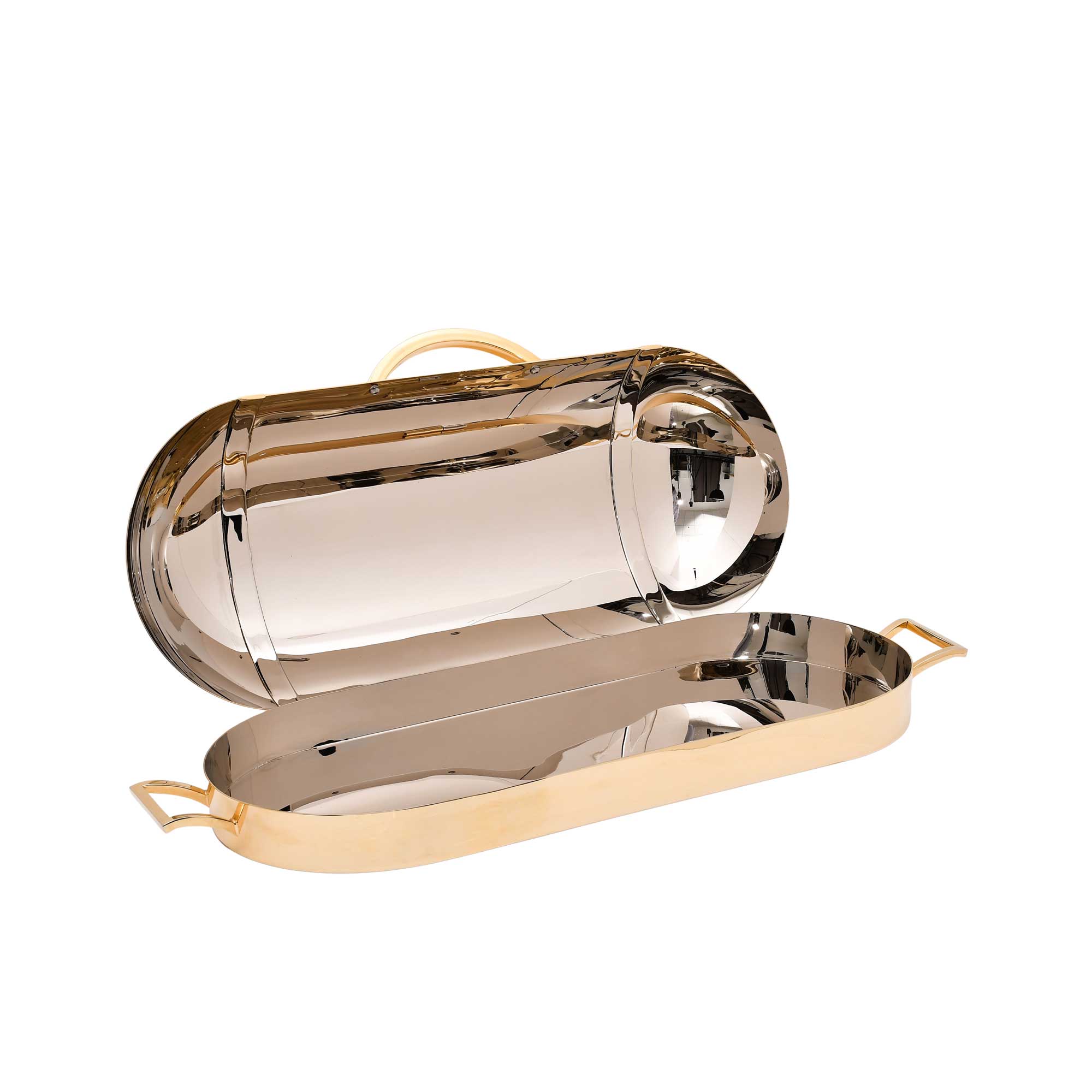 This stylish serving tray features an oval design with a sleek, metallic finish. The tray is equipped with a lid that opens to reveal a spacious interior, perfect for holding and presenting a variety of items. The tray's handles offer convenient carrying and serving. The combination of form and function makes this piece a versatile addition to any home or entertaining space.