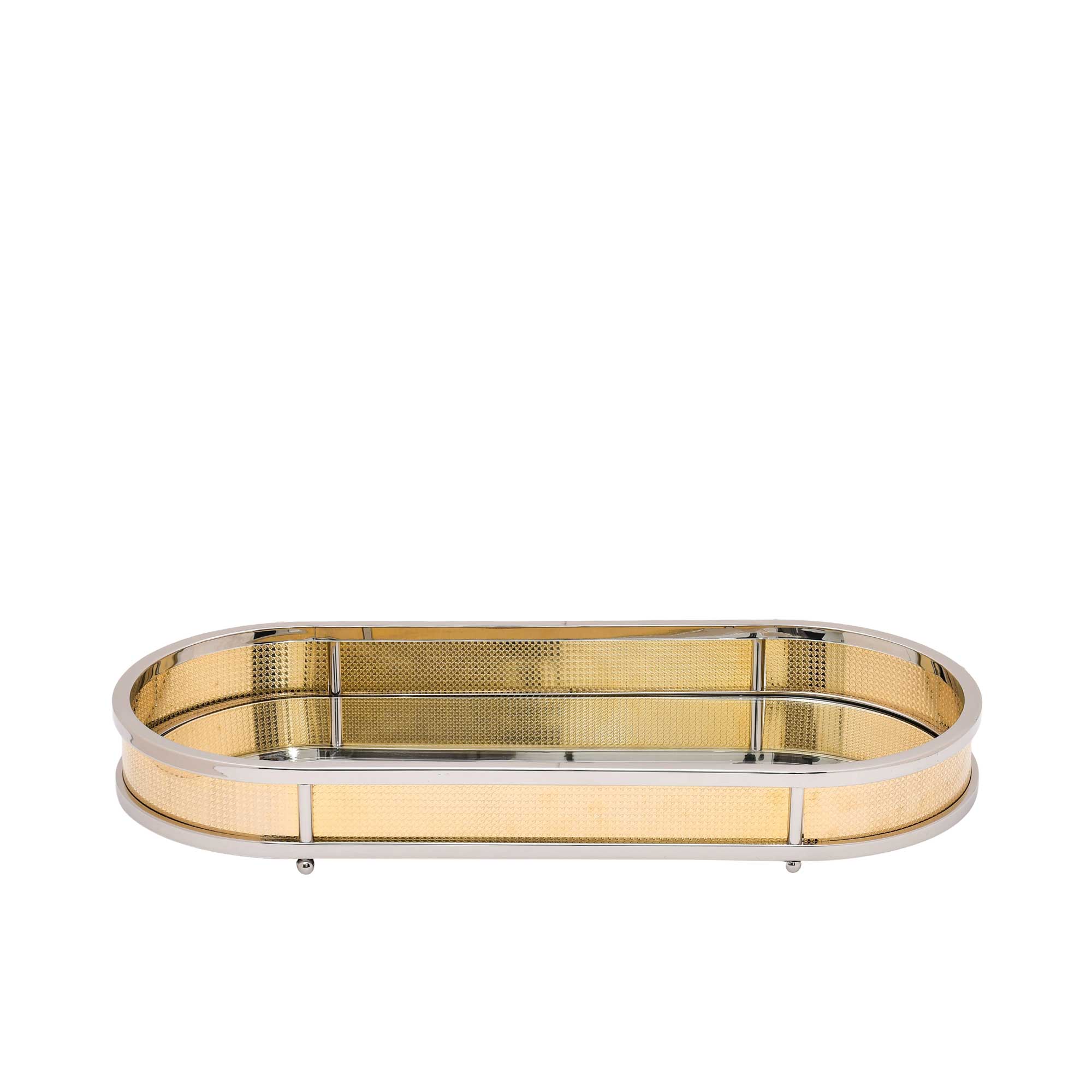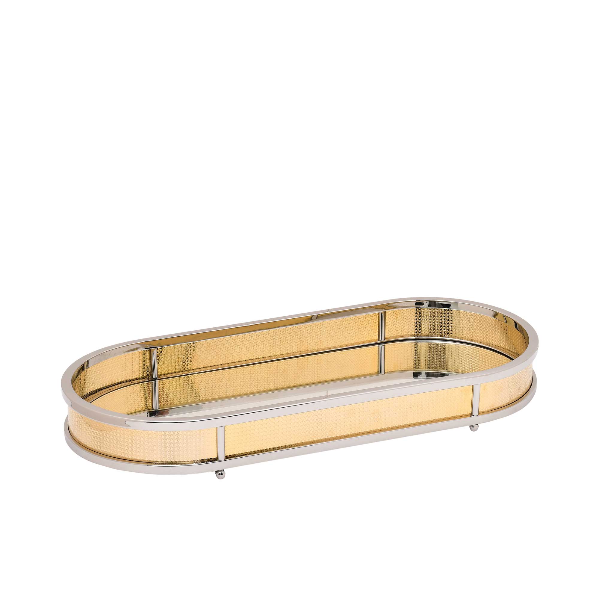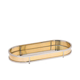 This elegant oval tray features a gold-toned metallic frame with a woven pattern. The frame surrounds a mirrored glass base, adding a touch of luxury and sophistication. The tray's raised edges and feet provide stability and ensure safe handling. Its design is perfect for serving snacks, drinks, or showcasing decorative items. The tray's reflective surface adds a touch of glamour to any setting.