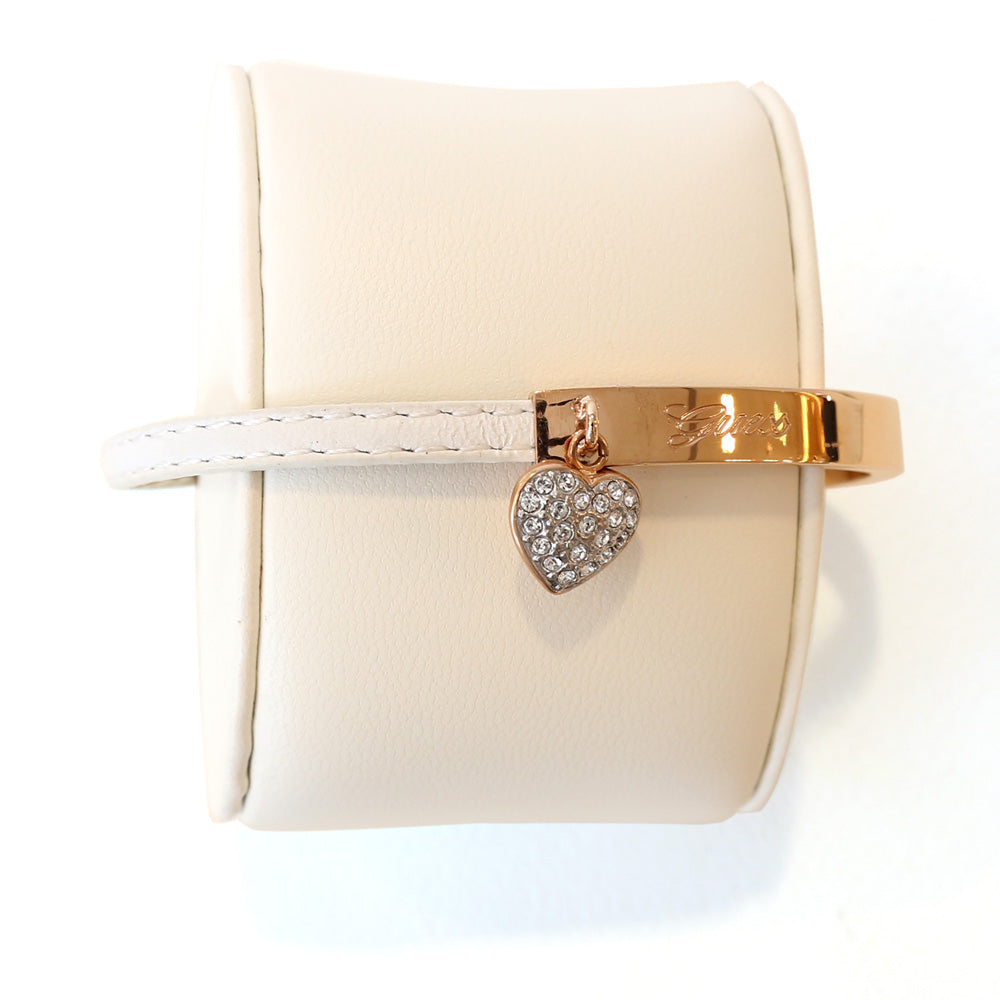Guess Fashion Accessories Bangle Rosegold and White Leather Strap with Stone Heart Charm