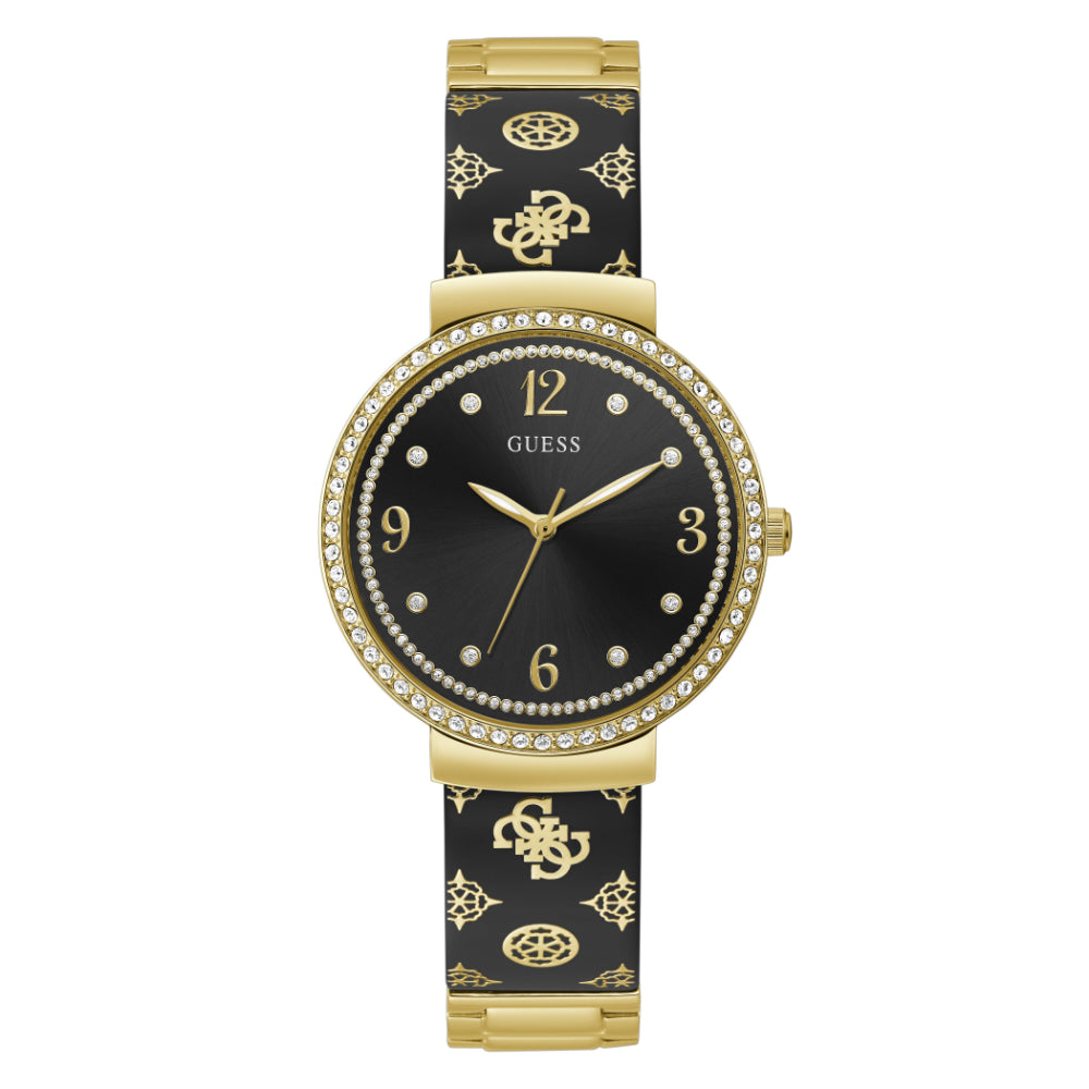 Guess Ladies Dress Stainless Steel Analog Watch Black Sunray Dial Gold Tone Polished Round Case Resin Strap With G-Link