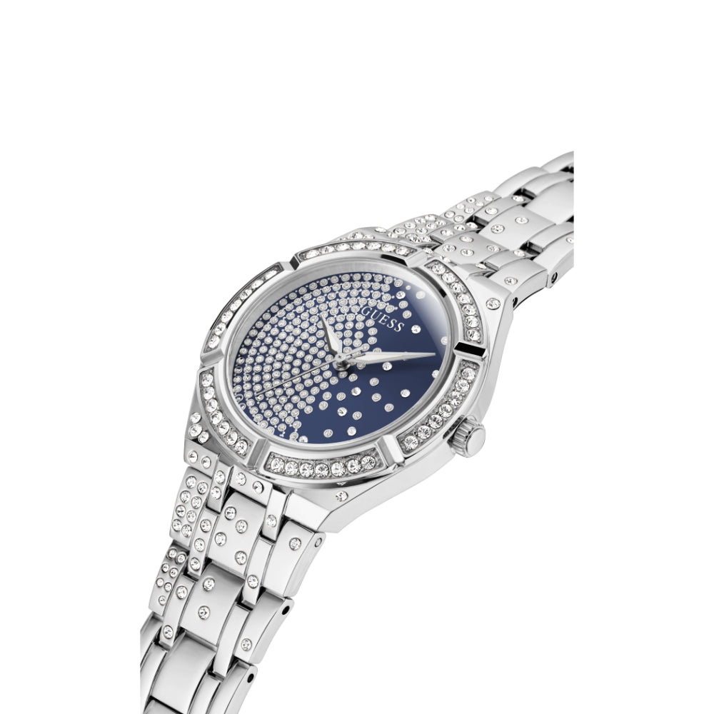 Guess Ladies Sport Stainless Steel Analog Watch Blue Sunray Dial Silver Tone Polished Round Case Stainless Steel Bracelet With Pilot Buckle