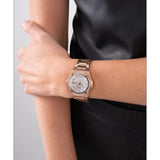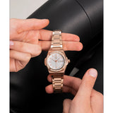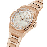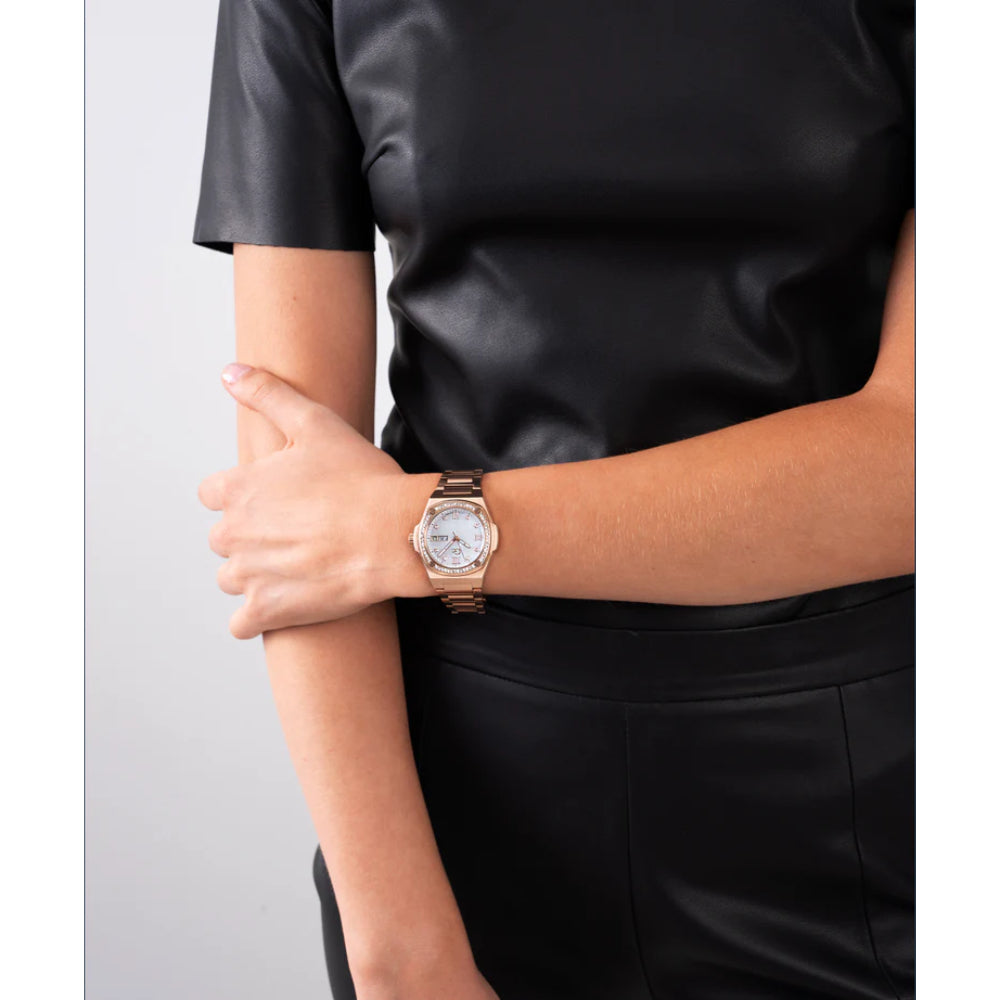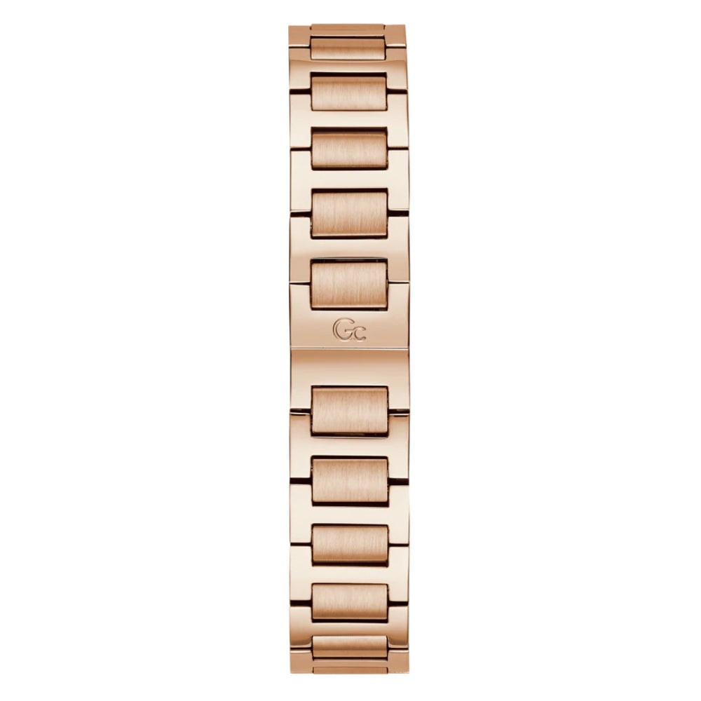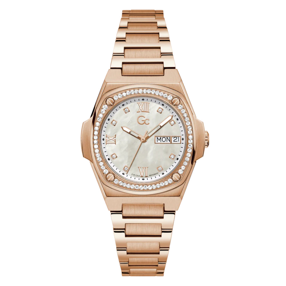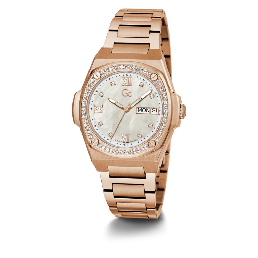 Revamp your style, with Gc Coussin shape and its square case.Rose Gold sophistication, and dazzling crystals give watch an elegant and daring allure.The charismatic case is holding a Day-date swiss movement that is visible on the dial within a window at 3 o’clock.It is encircled with crystals and have screw design details on the bezel.The full rose gold version has a white iridescent mother of pearl dial.This timepiece is comfortable to wear, thanks to the multi-links bracelet.