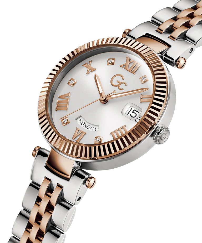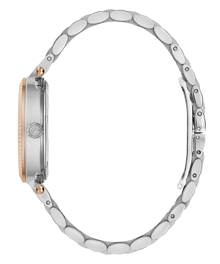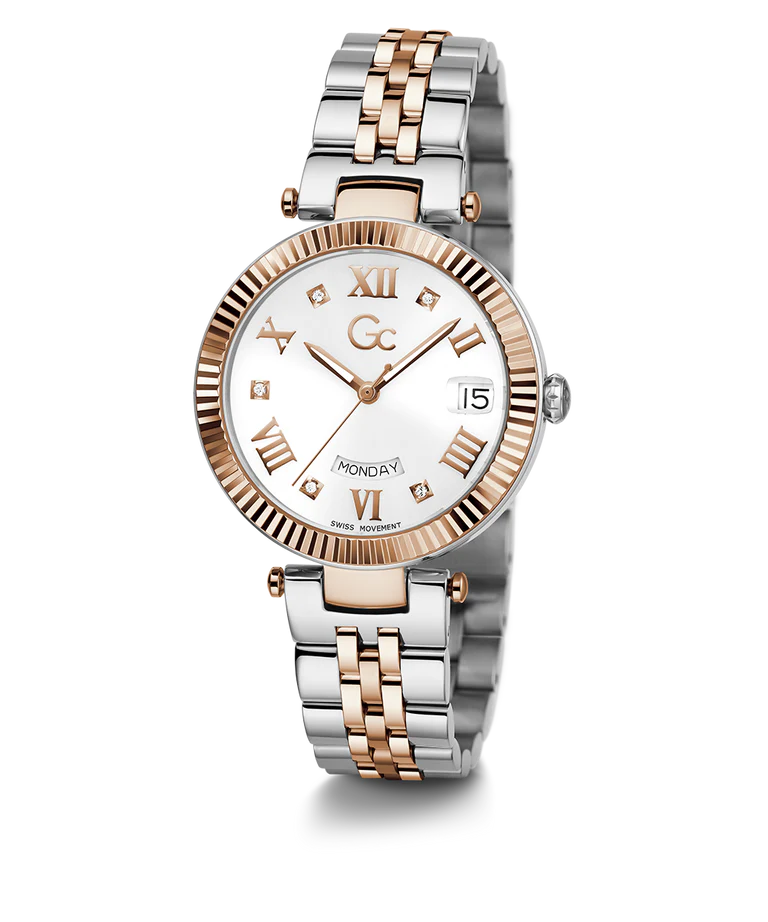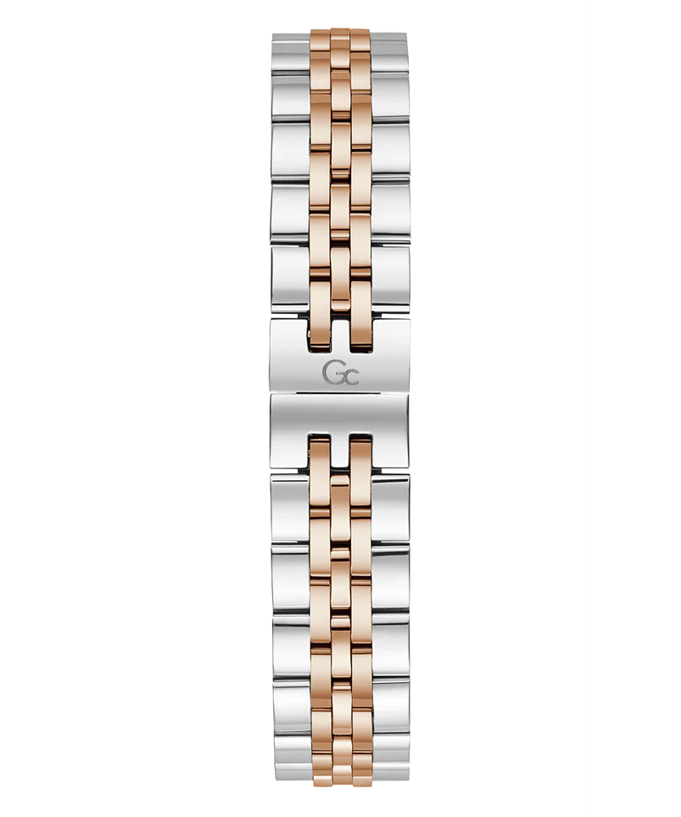 | The GC Flair Ladies Mid Size White Dial Two Tone Stainless Steel Watch is a beautiful and stylish timepiece designed for the modern woman. This watch features a white dial with a two-tone stainless steel case and bracelet, creating a sophisticated and versatile look. The five links bracelet adds to the elegance and durability of the watch, allowing it to be worn for both casual and formal occasions. The two-tone version of this watch also features a striking sunray white dial, adding a touch of luxury and sophistication. One of the standout features of this watch is its visible day-date Swiss movement, which can be seen through windows at 3 and 6 o'clock. This adds an element of practicality to the watch, making it perfect for those who want both style and functionality in their timepiece. In terms of durability, the GC Flair Ladies Mid Size White Dial Two Tone Stainless Steel Watch is water resistant up to 100 meters, making it suitable for everyday wear and even swimming or snorkeling. This watch is a perfect combination of style, functionality, and durability, making it a must-have accessory for any fashion-forward woman. SPECIFICATIONS • Brand: GC • Gender: Women • Attachement Color: Silver & Rose Gold • Band Material: Stainless Steel • Buckle/Clasp: Deployment Buckle • Case Color: Silver & Rose Gold • Case Diameter: 34 mm • Case Finish: Polished • Case Material: Stainless Steel • Case Shape: Round • Dial Color: White • Water Resistance: 100 |