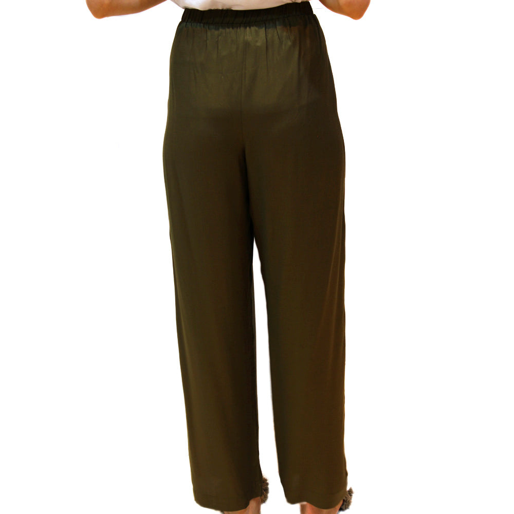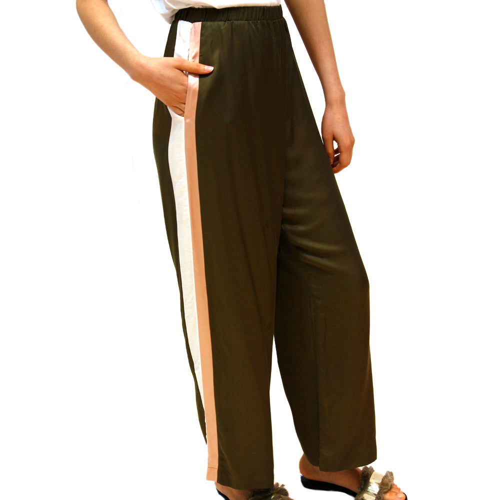 Modern pajama-look in trendy color blocking combination. Woven viscose material with an elegant sheen and silky look.