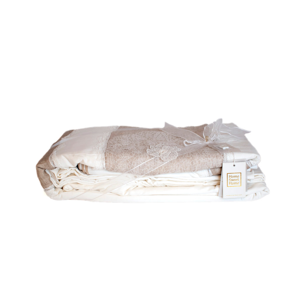 Sateen Cotton. 8 Pcs, 1 Duvet Cover 260X240.1 Flat Sheet 270X300, 2 Pillow Case 50X80 ,Bedspred 270X270,2 Pillow Sham 50X80,1 Cushion