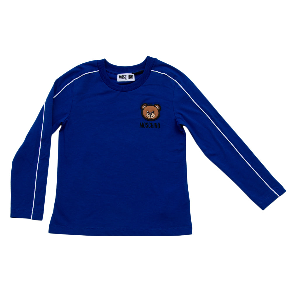 Teen boys long sleeve T-shirt by luxury brand Moschino Kid-Teen. Made in navy cotton jersey, it has white piping across the shoulders and sleeves. Unmistakably by the Italian designer, it has the iconic rubberised Moschino Teddy Bear logo badge on the front, with a black logo printed below.