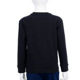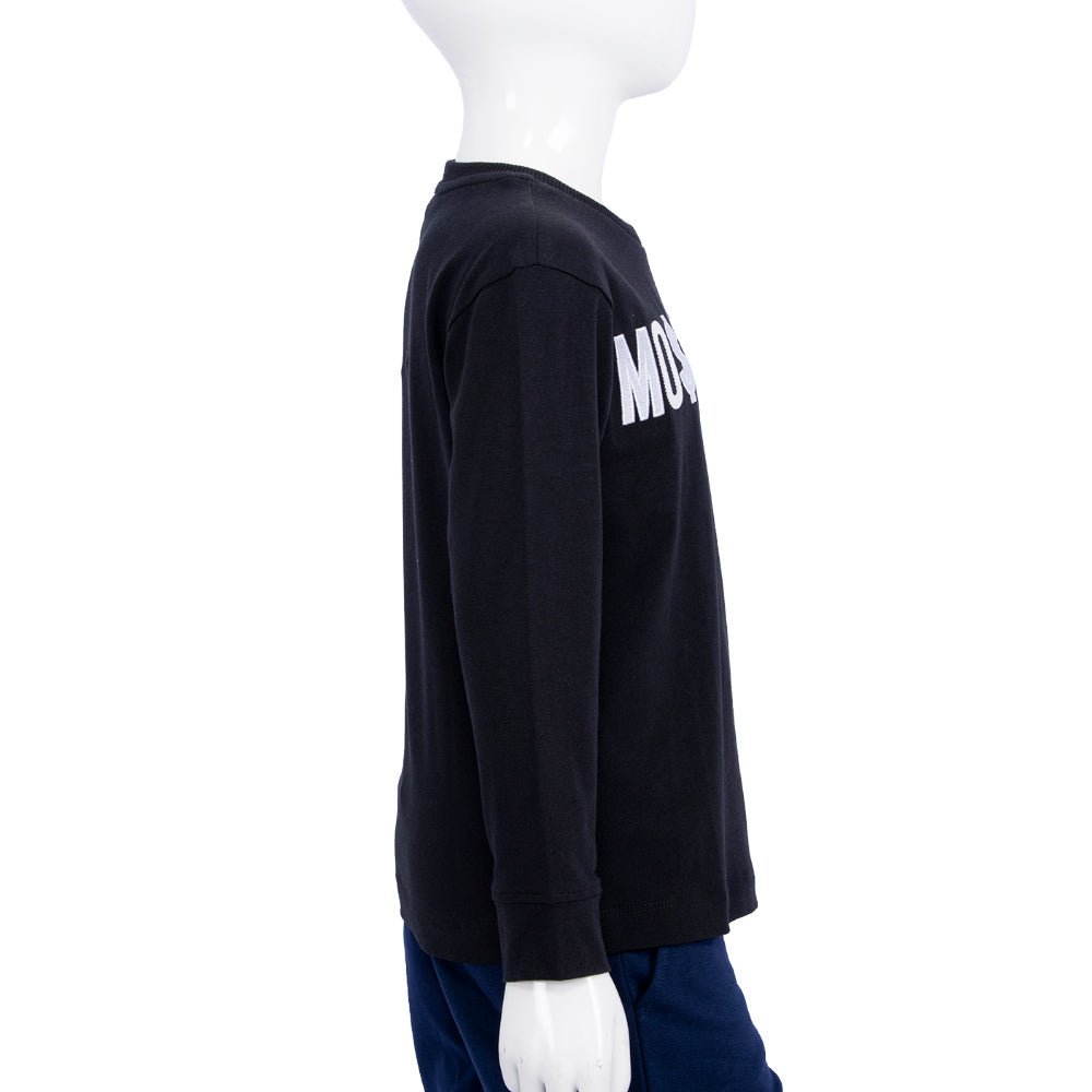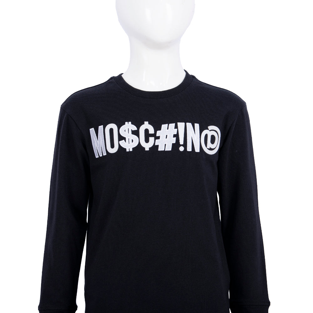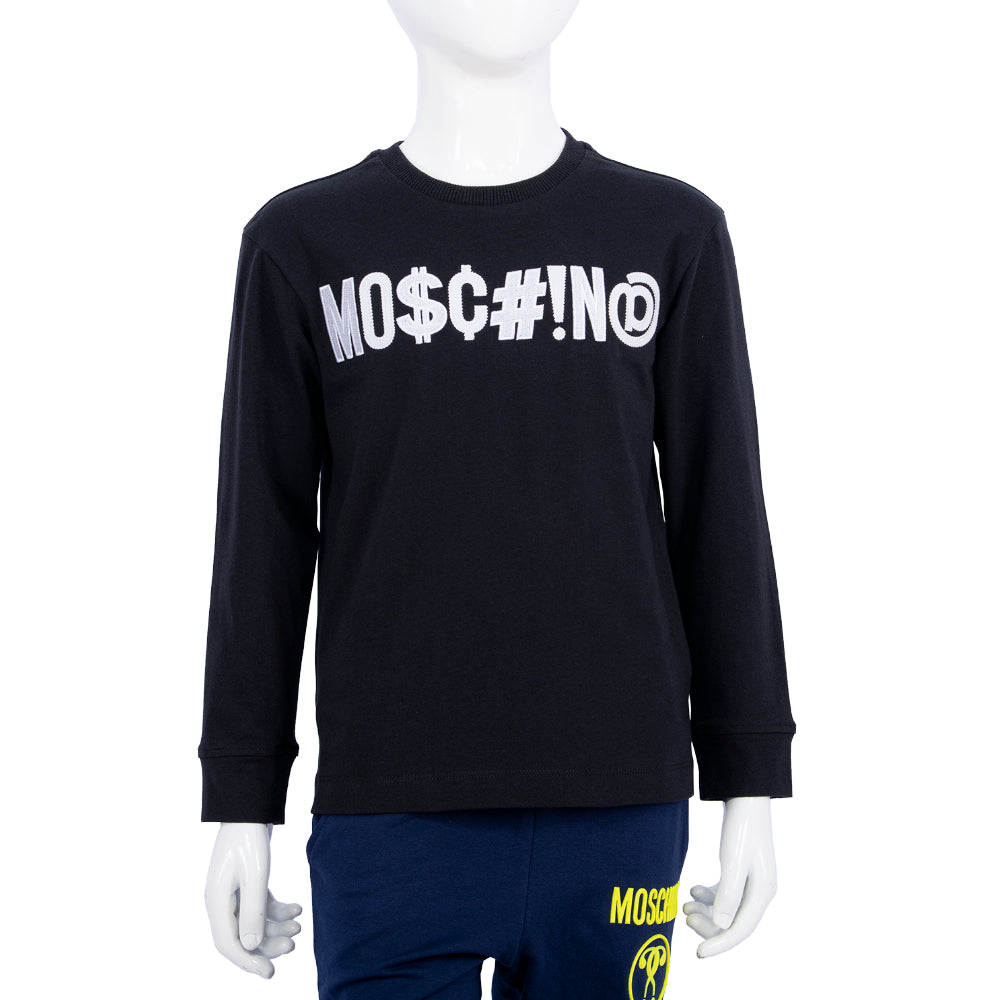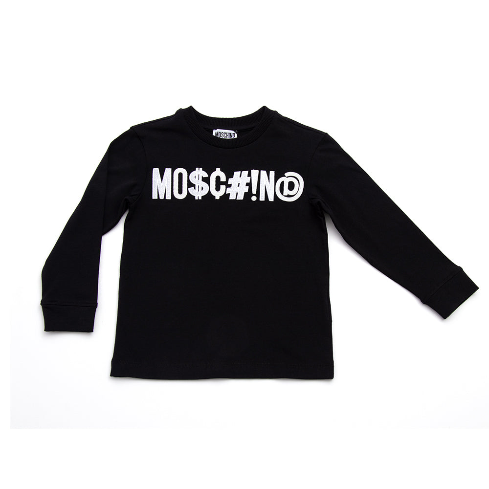 Black cotton jersey long sleeve T-shirt for teen boys by luxury Italian brand, Moschino Kid-Teen, as seen in the main collection. It has symbol logo appliquŽ lettering on the front in white.