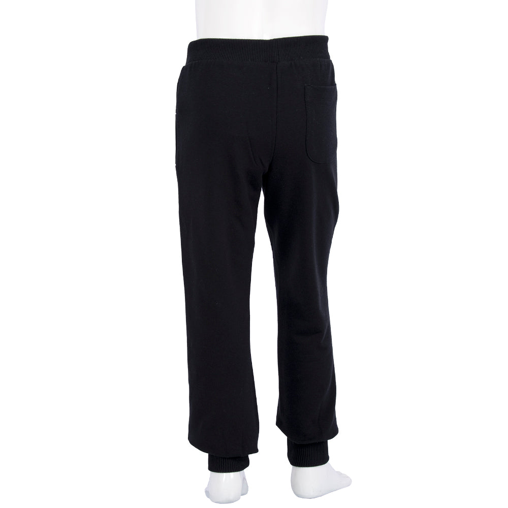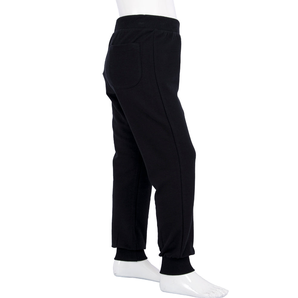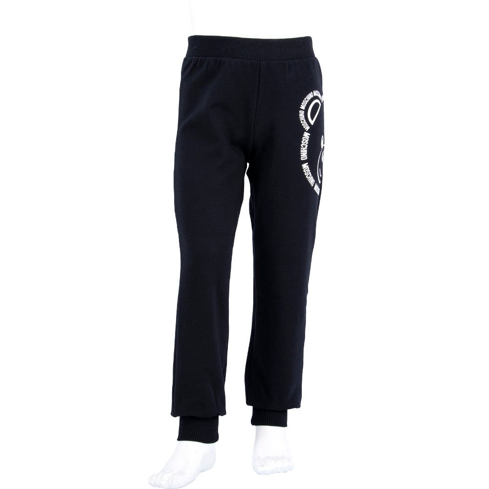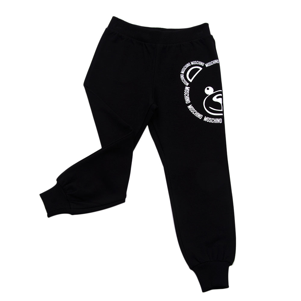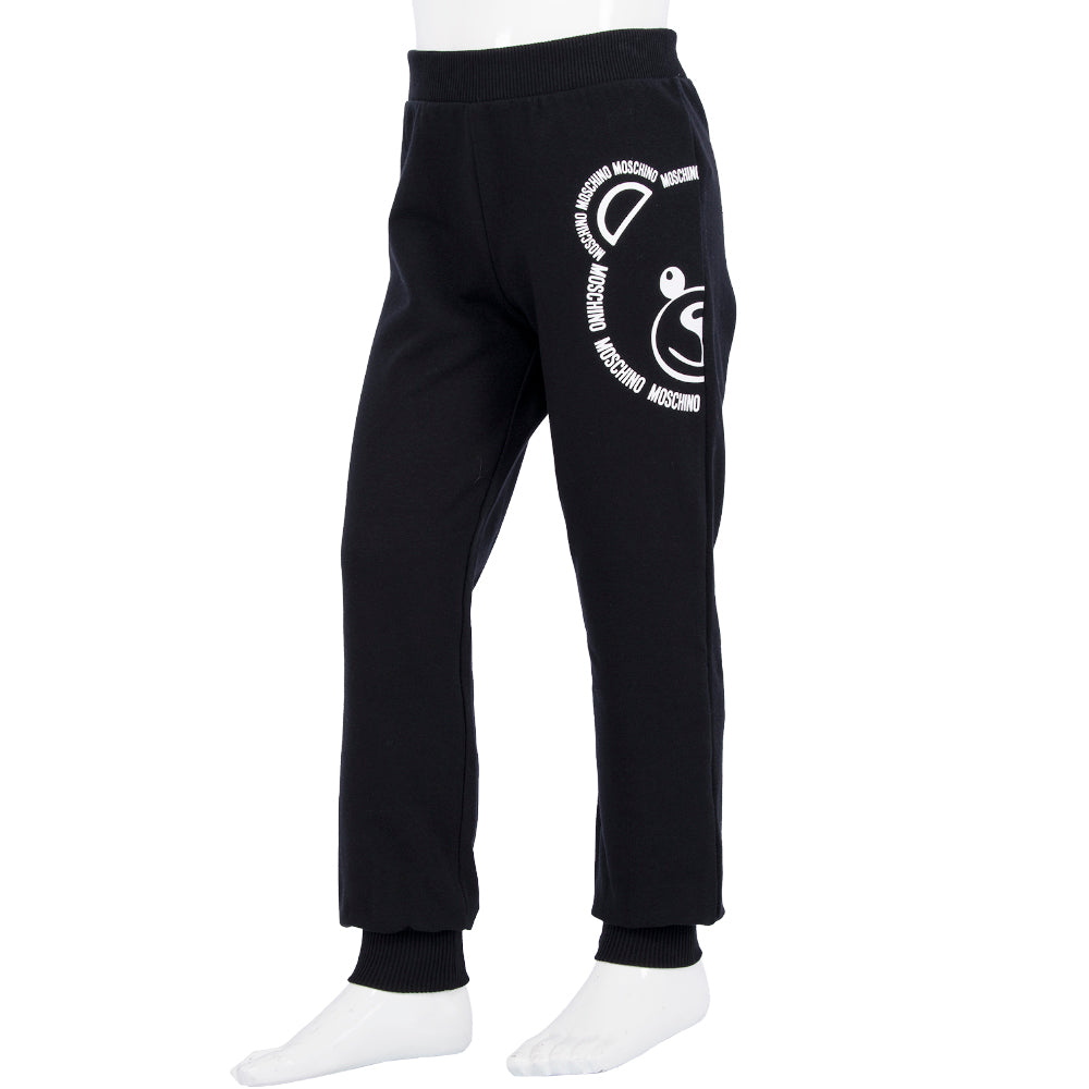 Boys black cotton jersey joggers by Italian luxury brand Moschino Kid-Teen. They have elasticated ribbed trims and a white Moschino Teddy Bear logo on one leg.