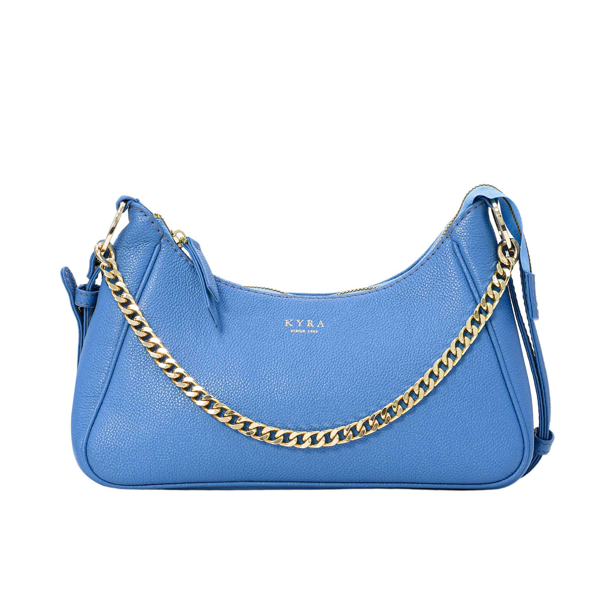KYRA Women's Ivy Calf Handbags Sky Blue is a versatile and stylish accessory for any woman's wardrobe. Made from high-quality calf leather, this bag is designed to last and provide a luxurious touch to any outfit. Its rectangular trapezoid shape is unique and eye-catching, while the curvy top zipper closure adds a touch of elegance. One of the standout features of this handbag is the signature unique Ring that connects the top of the bag. This allows for multiple wearing options - either as a handbag with the chain strap or as a shoulder bag with the unfolded leather strap. The strap is also adjustable, so you can make it the perfect length for a cross-body bag. The bag has a spacious interior, with enough room to hold your wallet, phone, car keys, and even some cosmetics. There is also a pocket inside to keep your belongings organized and easily accessible. This makes the KYRA IVY bag not only stylish but also practical for everyday use. In addition to its functionality, the sky blue color of this bag adds a pop of color to any outfit. It is perfect for both casual and formal occasions, making it a versatile and essential addition to any woman's wardrobe.