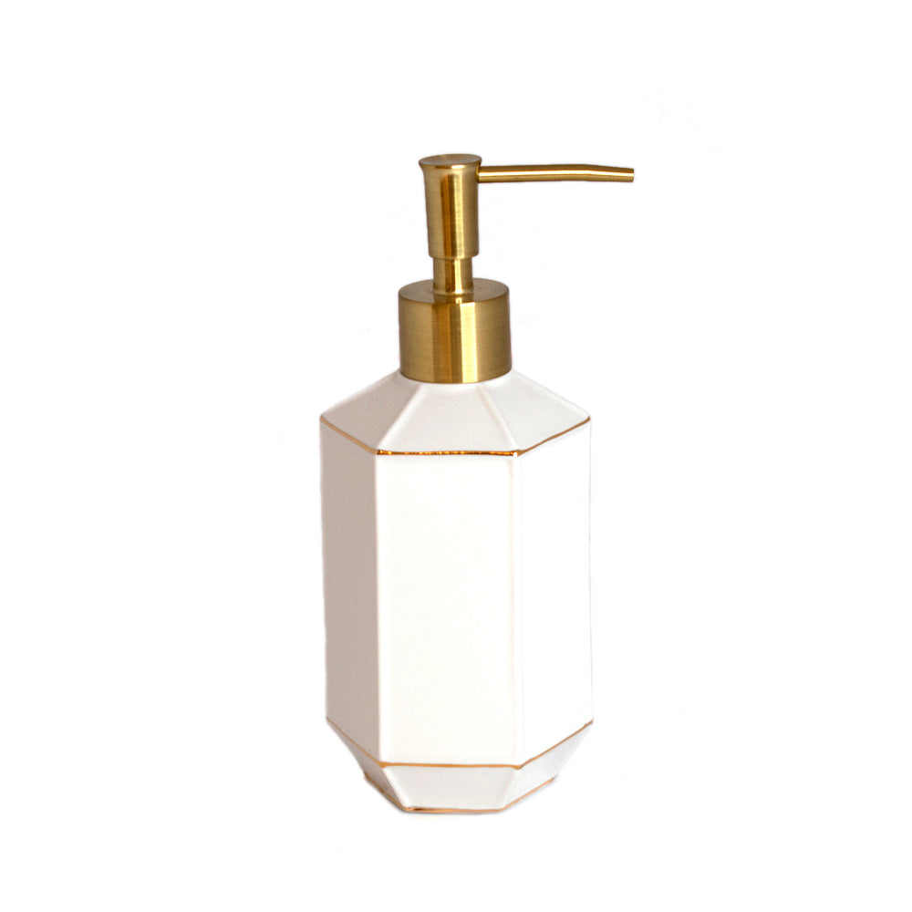 With its sophisticated hexagonal shapes and gold accented details, our St. Honore bath accessories are an exquisitely luxe addition to the bathroom. Porcelain and Imported. Lotion Dispenser: 2.87"L x 3.23"W x 7.83"H