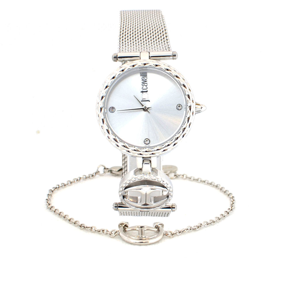 Just cavalli ladies watch set with bracelet silver case silver dial silver mesh bracelet