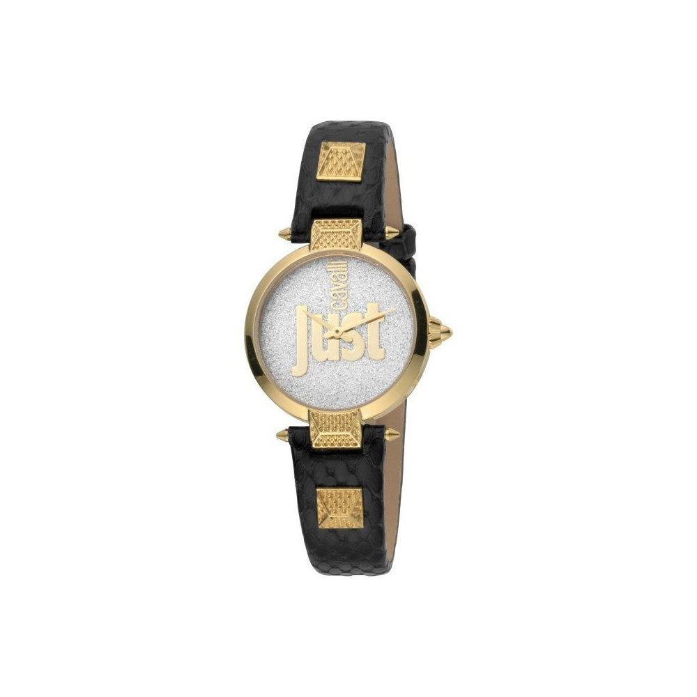 Just Cavalli Ladies Watch With Sliver Glitters Dial & Black Leather Strap