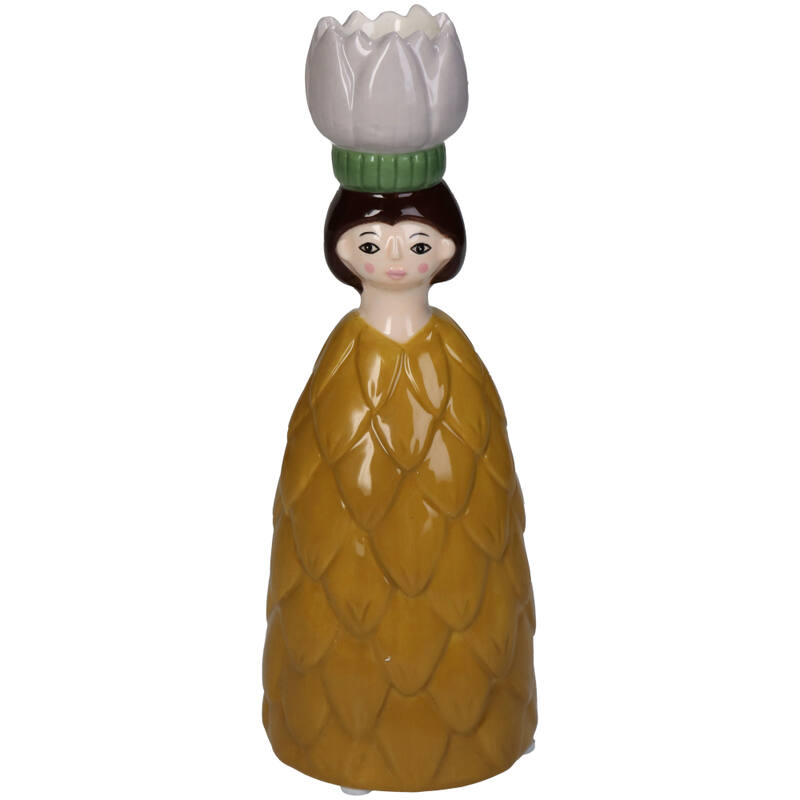 The Kersten Candlestick Flower Girl Dolomite Ochre is a charming and unique ceramic candlestick designed to add a touch of whimsy to any space. Hand-painted with a glossy varnish finish, this candlestick features a girl-shaped figure with a chandelier over her head, creating a beautiful and interesting contrast between the delicate flower girl and the elegant chandelier. The candlestick is made of dolomite, a type of clay that is durable and perfect for creating intricate and detailed designs. This candlestick is not only functional as a holder for your favorite candles, but it also makes for a beautiful decorative piece that will surely catch the eye of any guest. Whether used as a centerpiece or displayed on a mantle, the Kersten Candlestick Flower Girl Dolomite Ochre adds a touch of charm and character to any room.